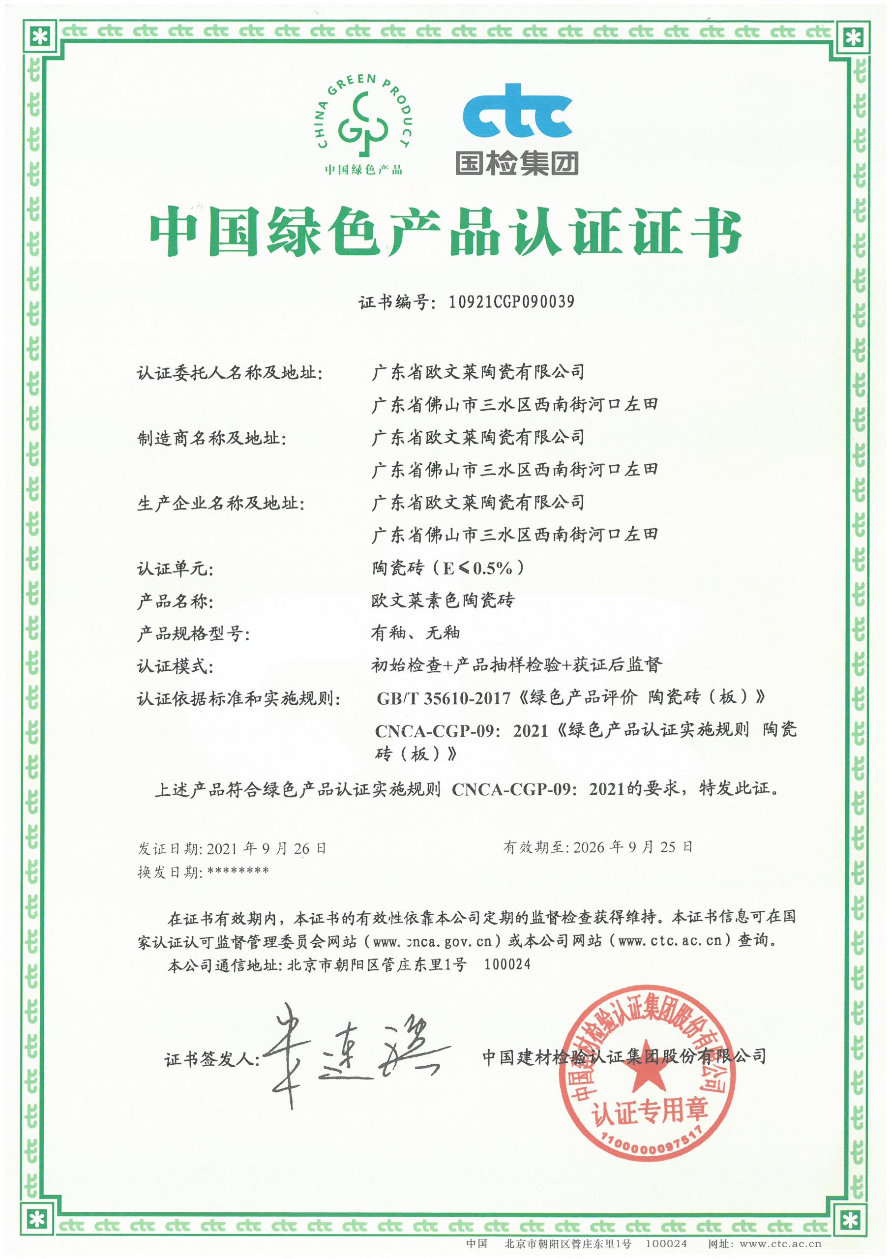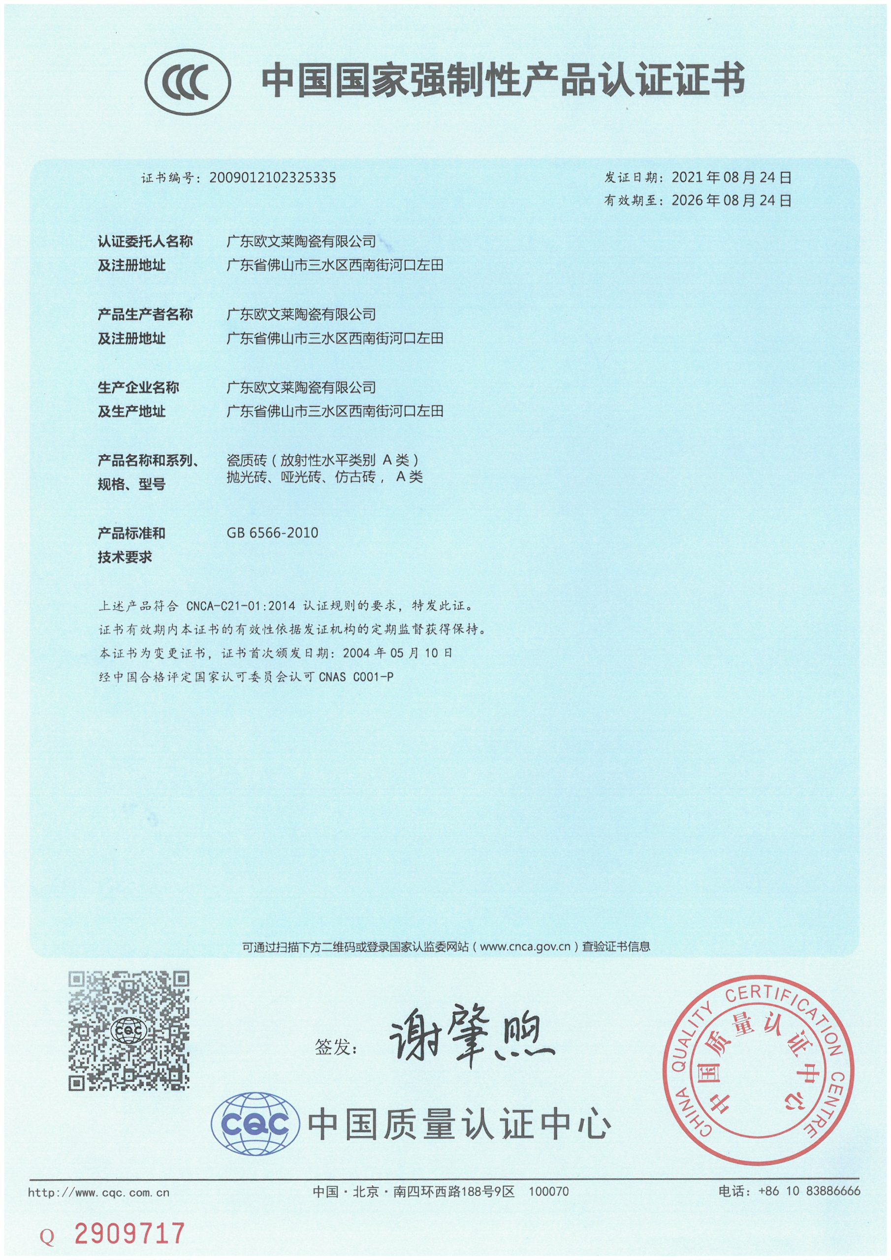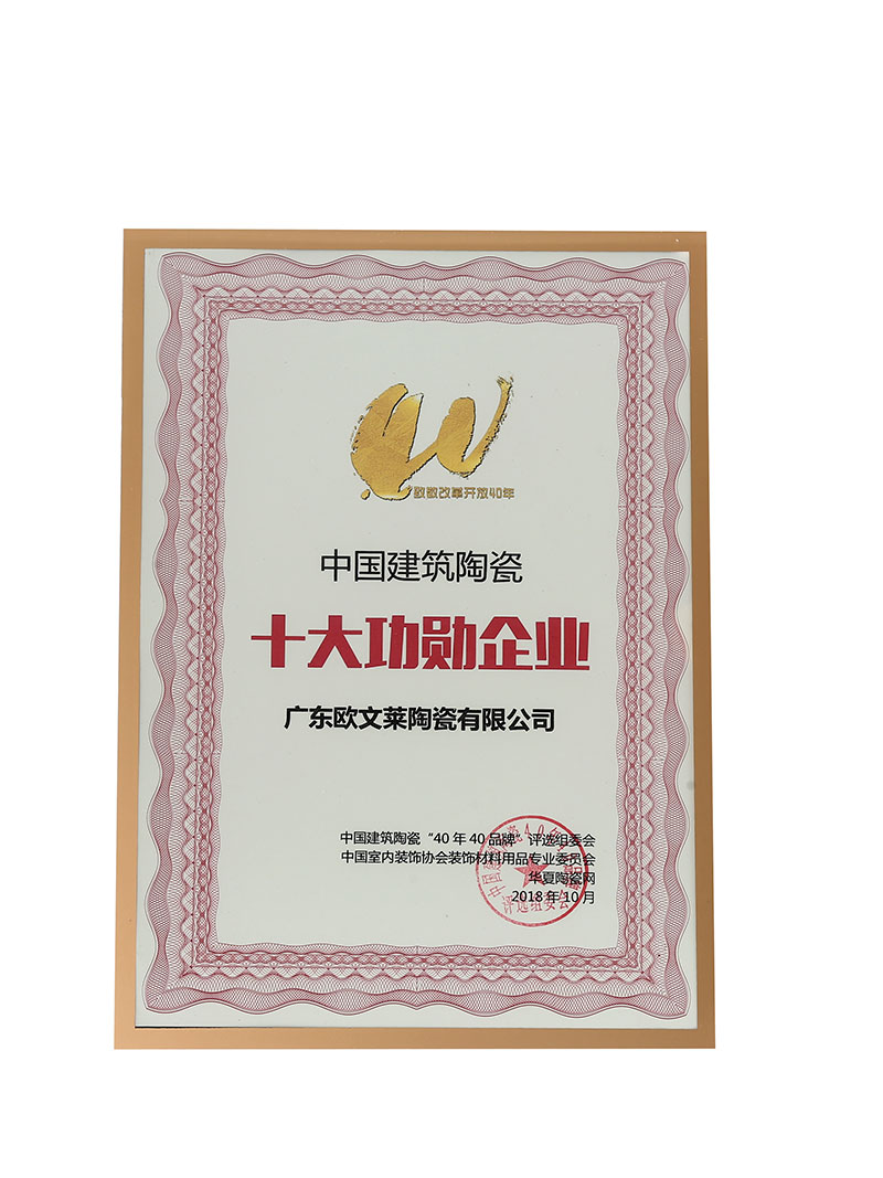 欧文莱执行国际高端制造标准,建立国际化、智能化、专业化的瓷砖生产线,精准控制瓷砖的品质出品。欧文莱与意大利顶级设计研发机构建立长期战略合作,凭借先进制造技术和自主研发能力,多项研发成果入选国家火炬计划。欧文莱享有SGS、NSF、GREENGUARD等国际权威认证,代表欧文莱的产品环保、品质受到国际认可,是极少数三证齐全的中国品牌。
