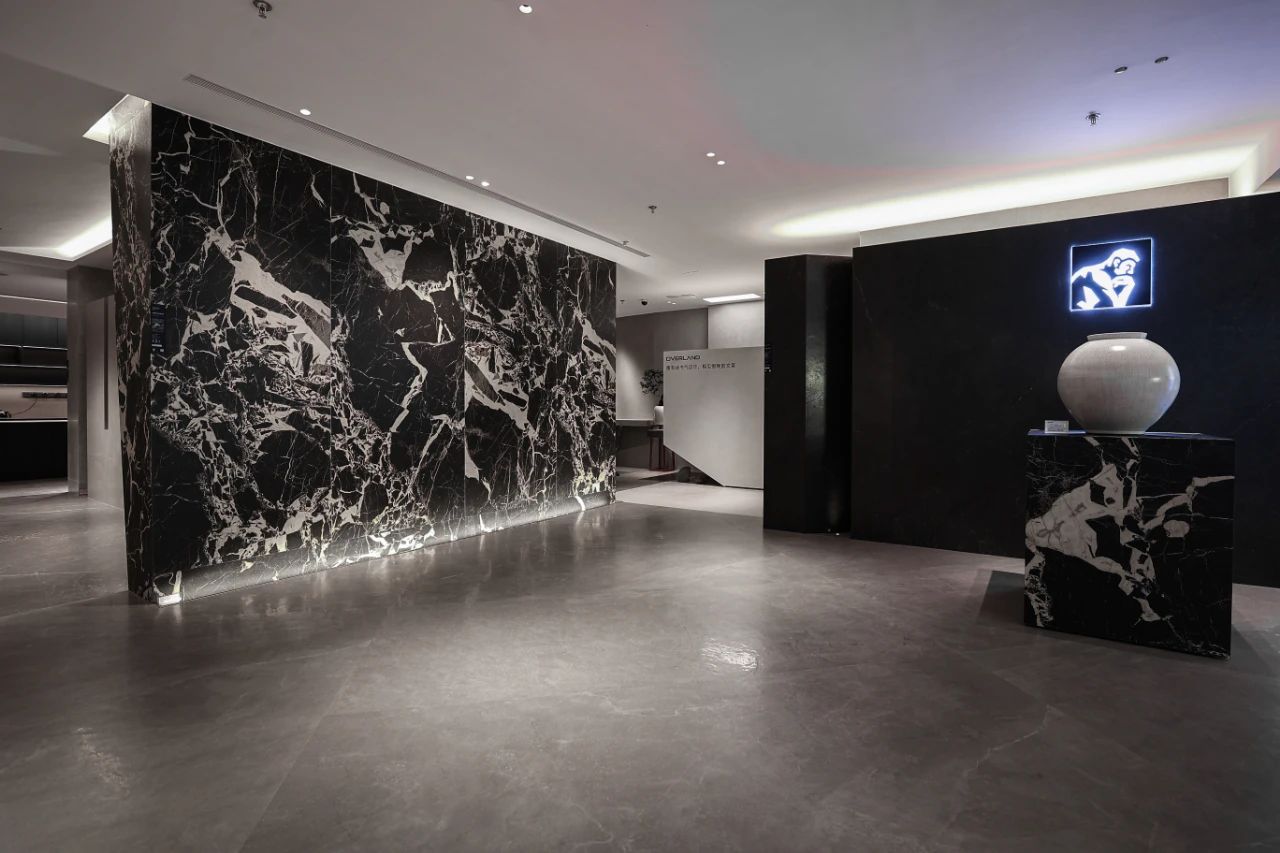 欧文莱厦门高级体验店美感的精髓,主要体现在用色克制,有温度的朴拙感。欧文莱的审美不被一时风向左右,在常年摸索中,偏爱在自然元素、时间痕迹、艺术人文中寻找灵感,形成自己的素色美学设计观,产品应高阶审美而生。新店从外立面到门厅部分皆紧密围绕第七代符号产品[时光盒子]系列展开,既有大面积铺陈的简约干净,亦有晕染自然的水墨画般艺术美感,营造出如艺术馆的空间张力。整个空间应用内建筑的手法,在不同切割、拼合的几何中,呈现出精致的线条感与强烈的空间感。通过丰富的设计细节,创造出功能与美感共融的视觉焦点。几何影壁、楼梯踏步、墙体凹槽……暗藏光源从一侧透出,成为空间中引人入胜的细节景致;在整个灯光系统的营造下,则是一气呵成的自然流淌,于无声处带来妥帖体验感。行走中放慢脚步,每一步都可感受移步换景的建筑空间艺术。从门厅、家居体验场景延伸至选材区,通过软装的排列布局营造出温馨的空间场域,可远观、可近赏。对理想主义者来说,装修是陷入一场对细节的锱铢必较,辛苦却值得。欧文莱精品岩板、素色瓷砖作为空间的主要材料,纹理素雅、光感柔和、触感舒适、内敛的高级感,运用到场景中,表现出质感满盈的视觉效果。