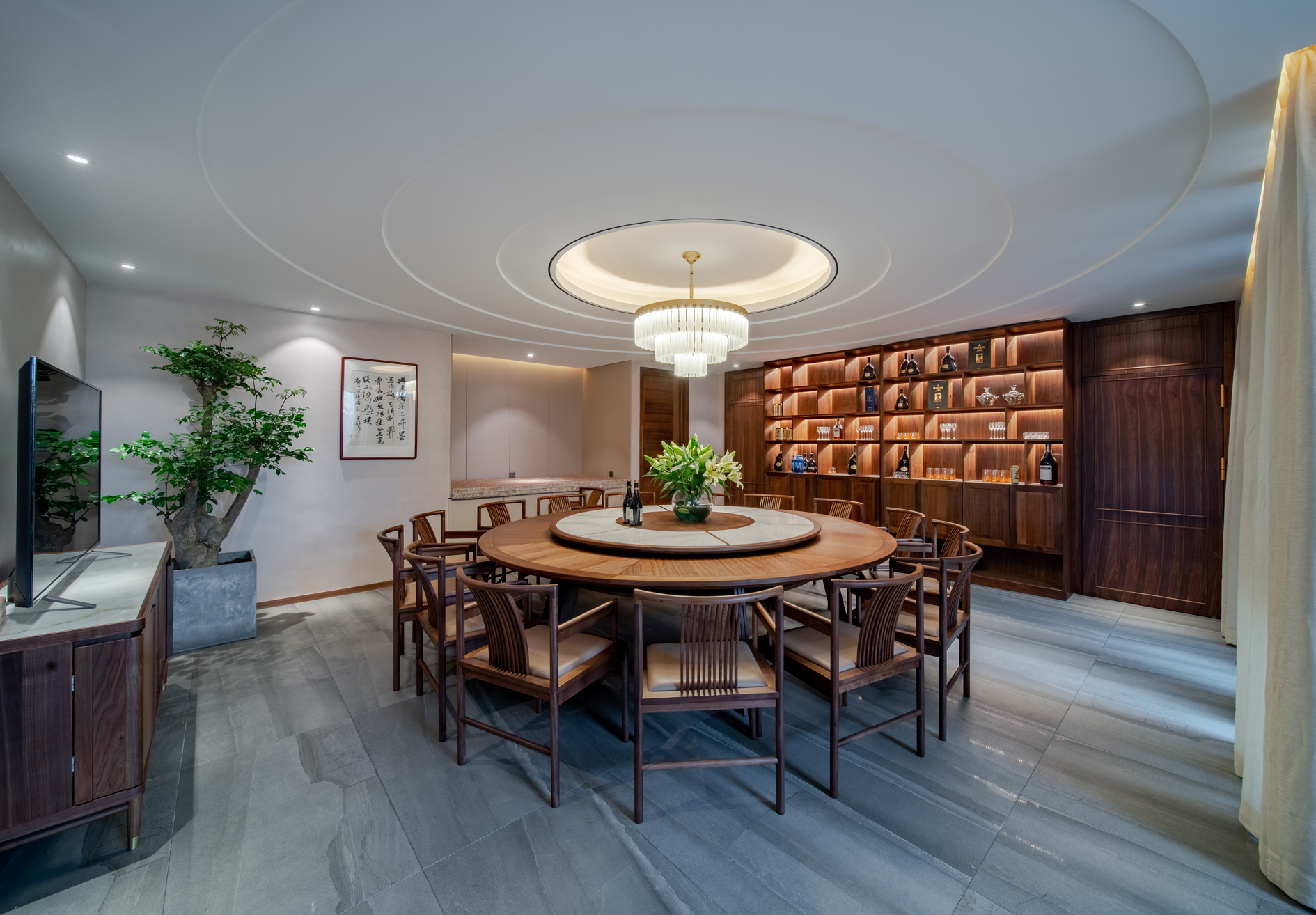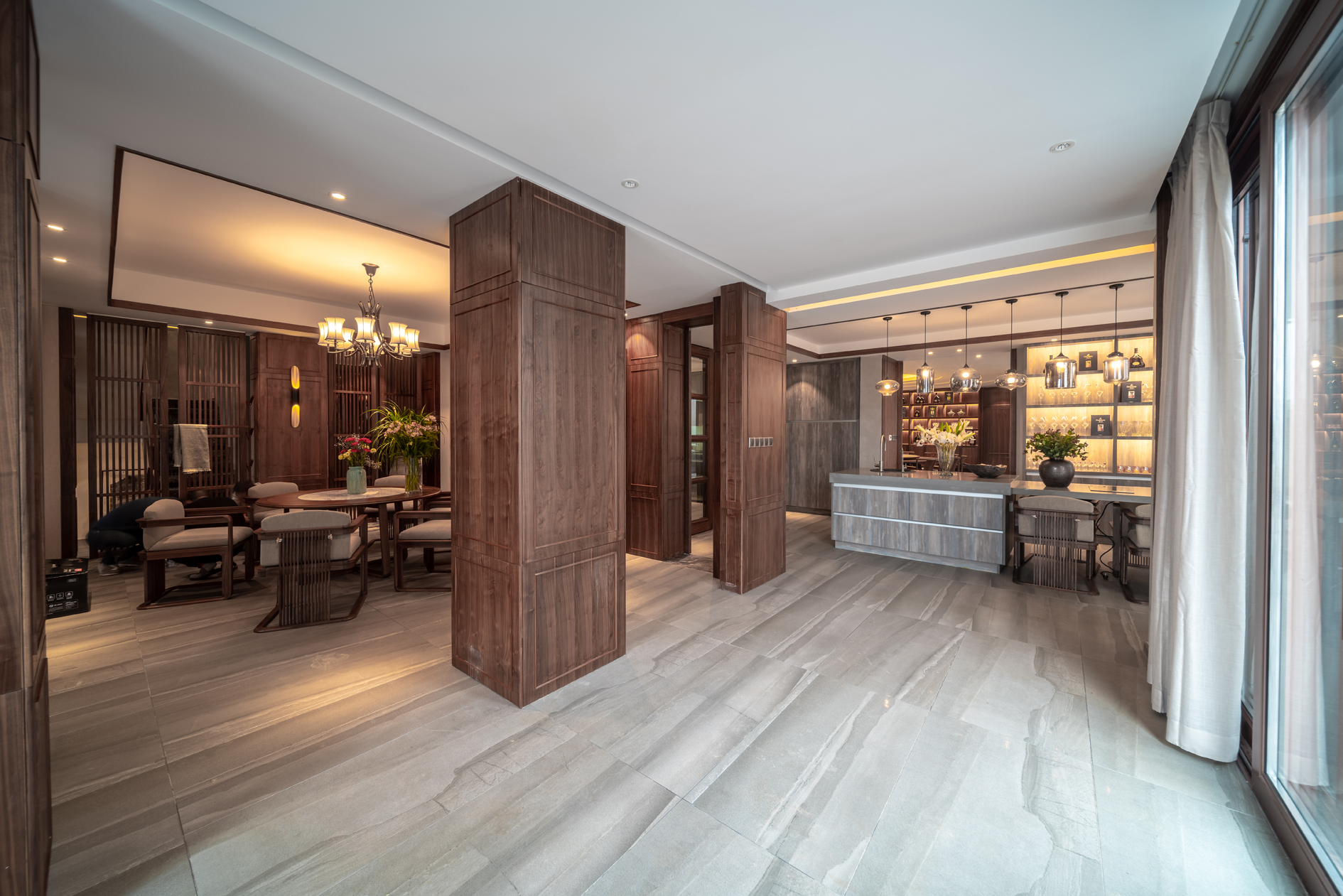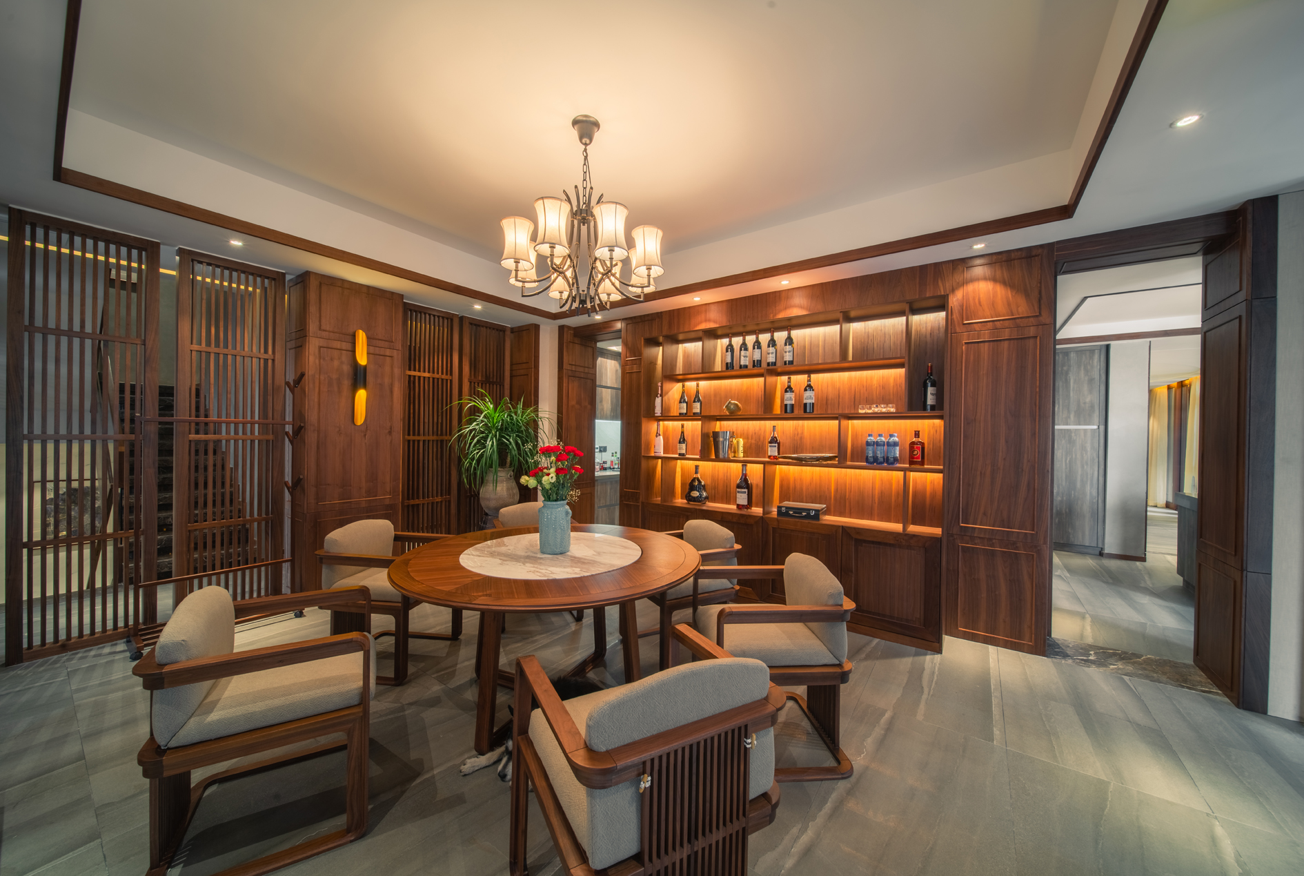 本案瓷砖主要选用欧文莱素色现代砖“欧文莱灰”系列、“冰凌石”系列、“梦想”系列、“宙斯”系列,中式元素与现代材质的巧妙兼柔,空间整体基调有现代的轻松舒适,也有新中式的古典韵味,给传统家居文化注入了新的气息。
