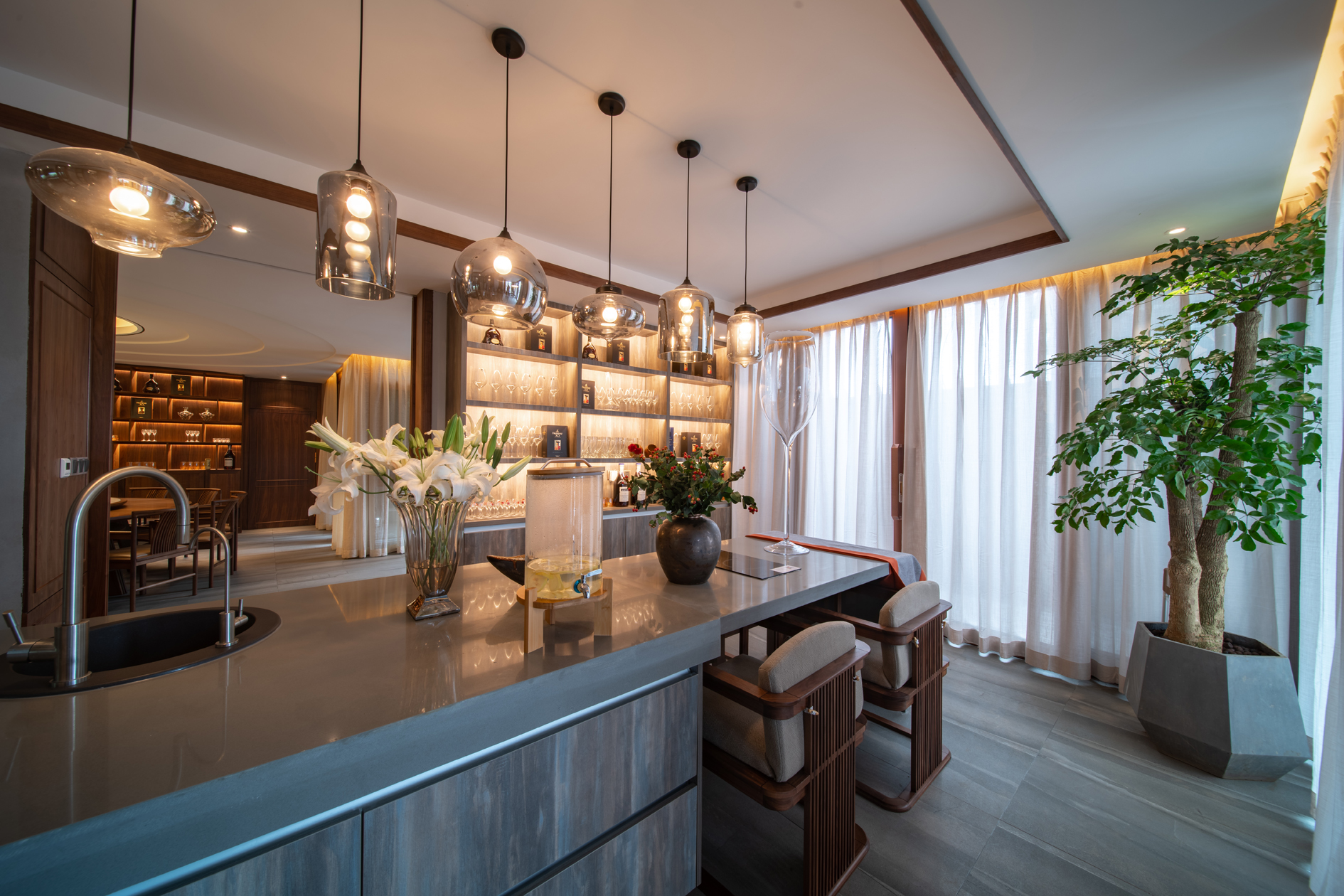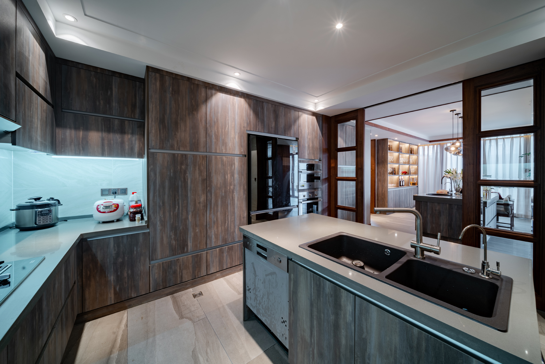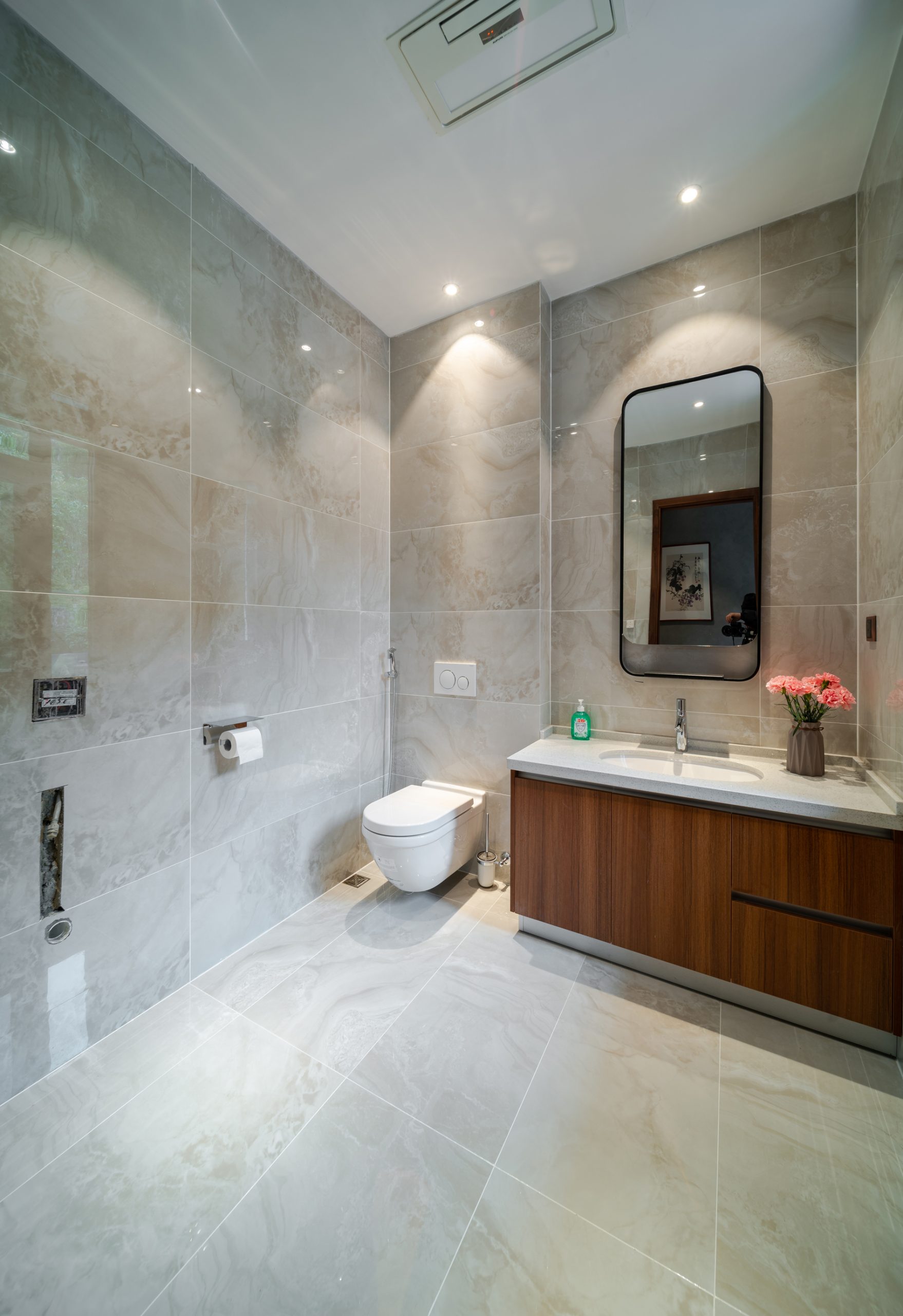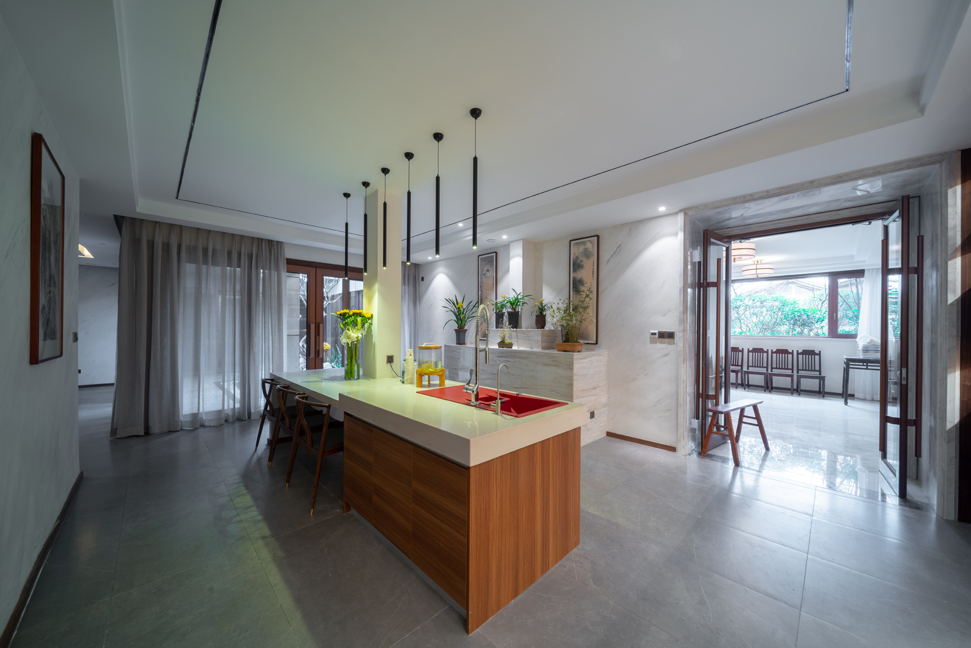 本案瓷砖主要选用欧文莱素色现代砖“欧文莱灰”系列、“冰凌石”系列、“梦想”系列、“宙斯”系列,中式元素与现代材质的巧妙兼柔,空间整体基调有现代的轻松舒适,也有新中式的古典韵味,给传统家居文化注入了新的气息。