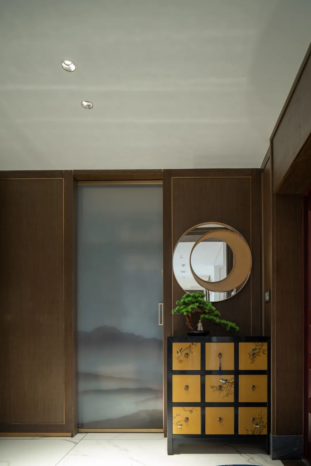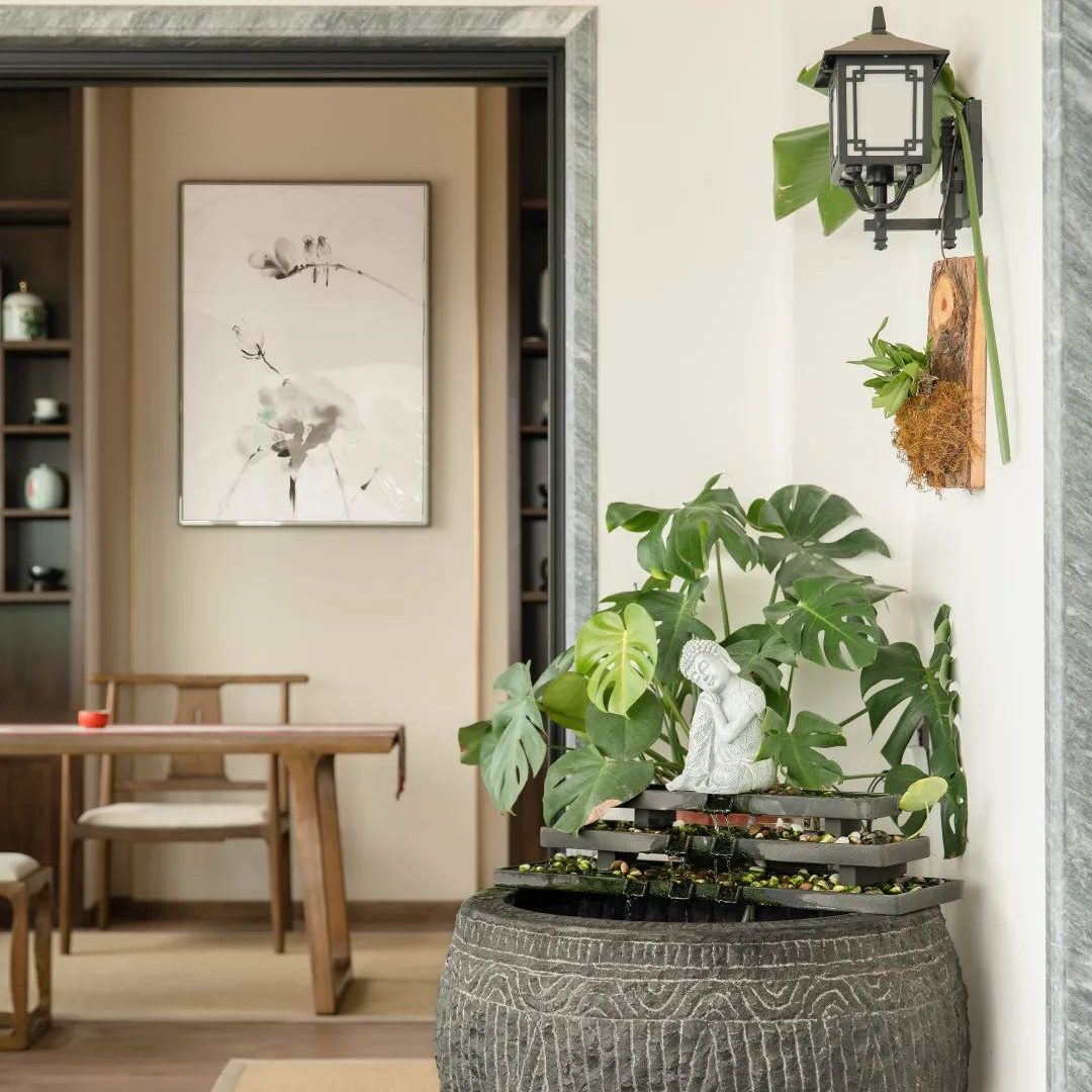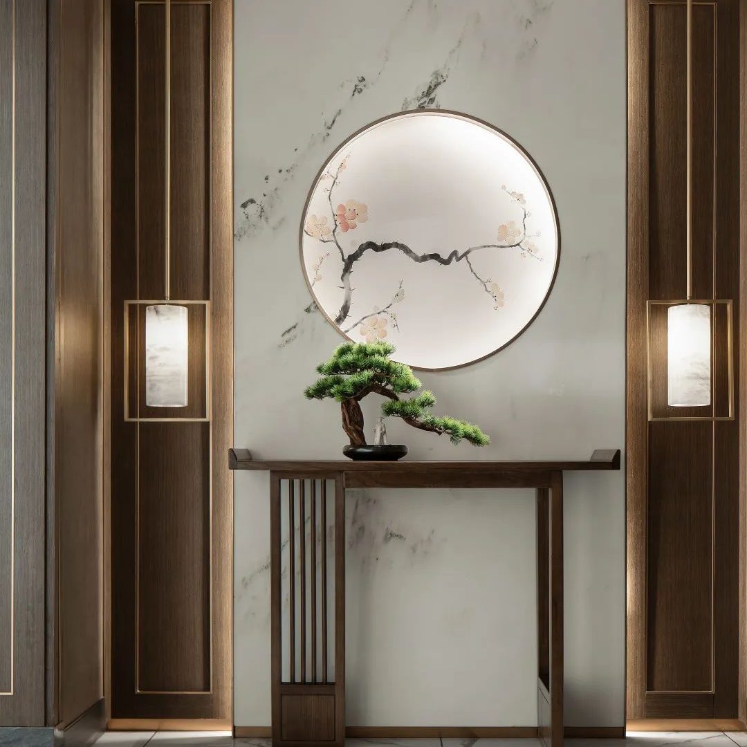 入户与玄关奠定了整体的空间风格。原木与大理石的搭配将古朴与现代圆融一体,古木案台结合中式吊灯,绿松、红梅共筑传统古典园林小景,既有端方大气的稳重,又带来春日偶成的清新感。