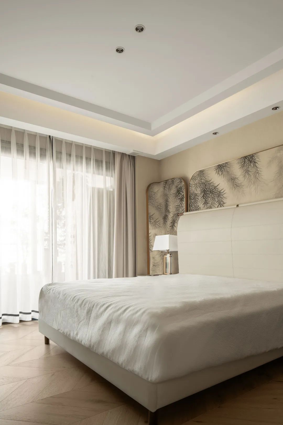 次卧融入雅致的中国风,床头背景墙选用清风徐徐的竹林画面做屏风式设计,用朴实自然感烘托出东方神韵,将古典元素巧妙与现代风格相结合,当白纱窗帘随风而动,光影疏疏朗朗照在“竹林”,隐世山林,江湖快意。