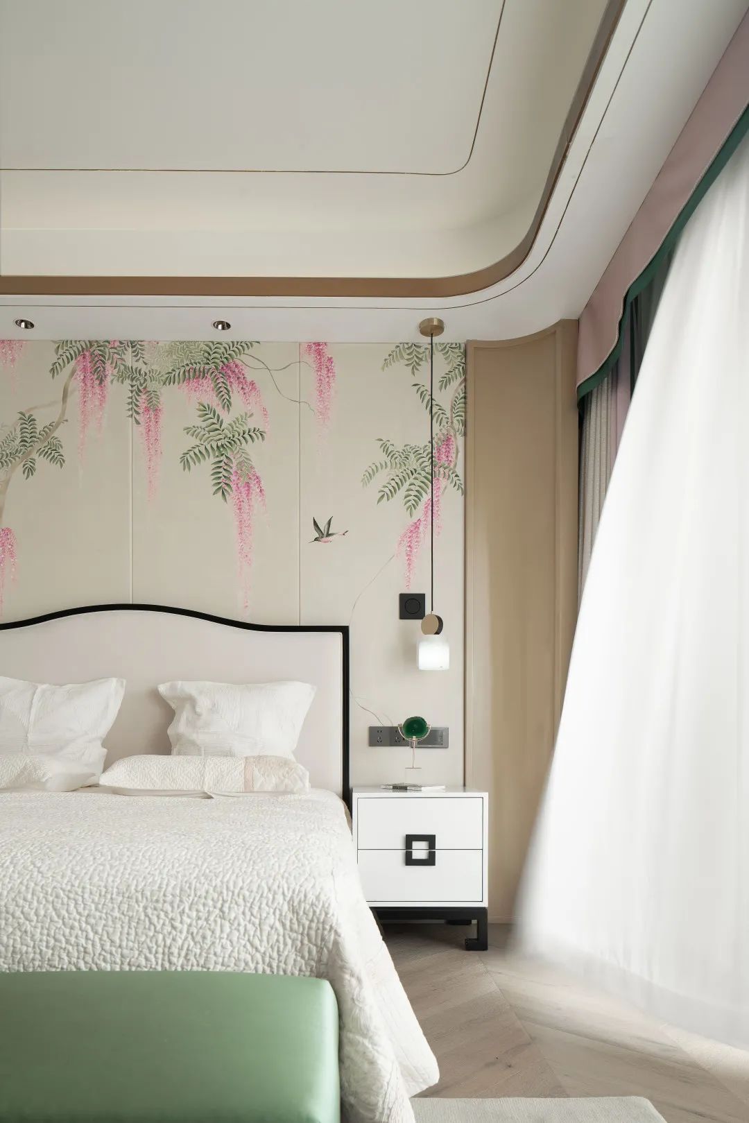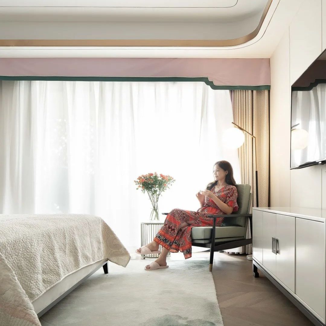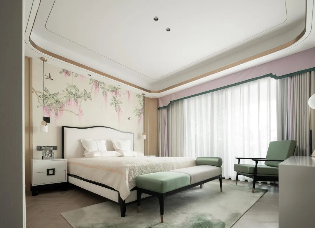 主卧给人清新自然感,柔和的粉黛色温暖了整个空间,或清雅含蓄、或爽朗优雅,于草长莺飞、樱红柳绿间勾勒出诗情画意;同时窗帘与背景墙的色调一致,床尾凳、躺椅选择与地毯统一的淡绿色,青山远黛,白云空流,闲适之感流淌在整个卧室。