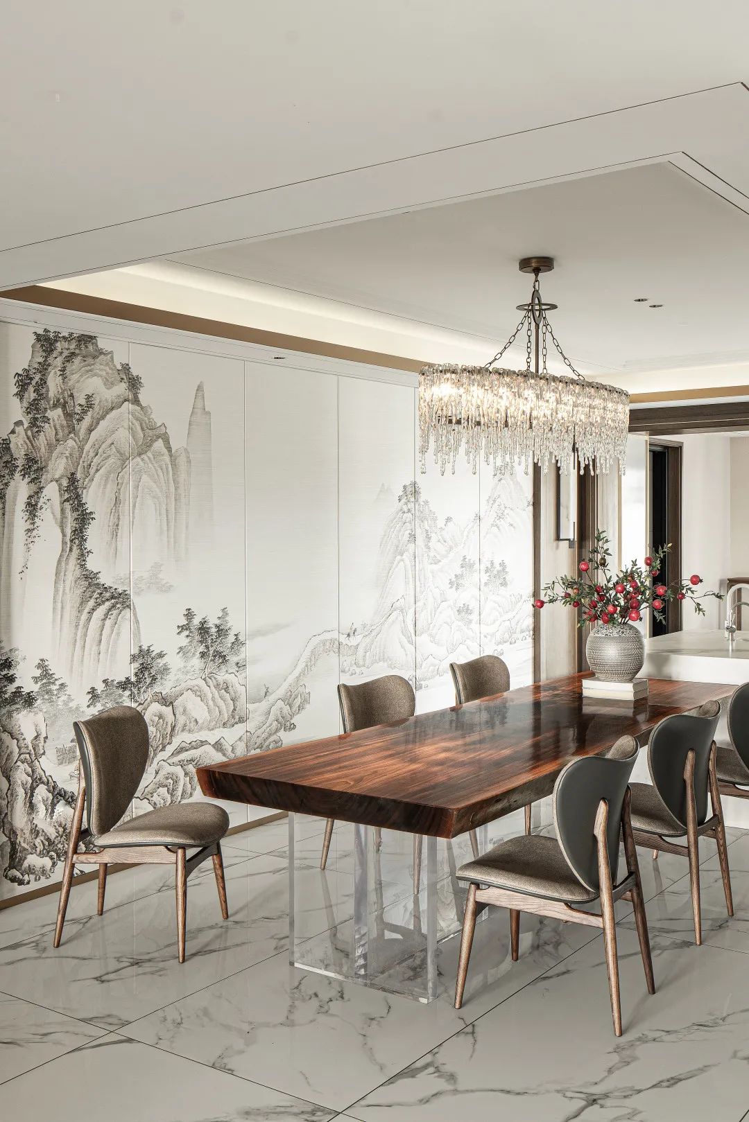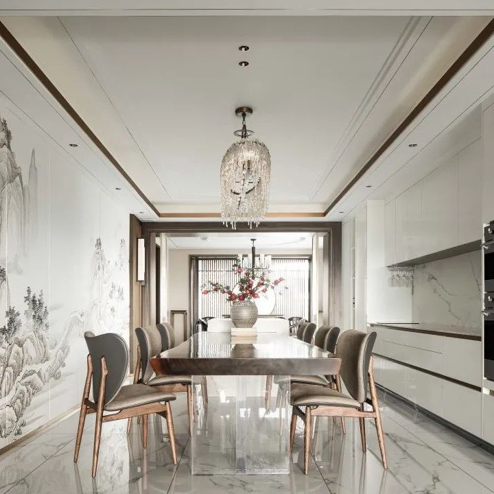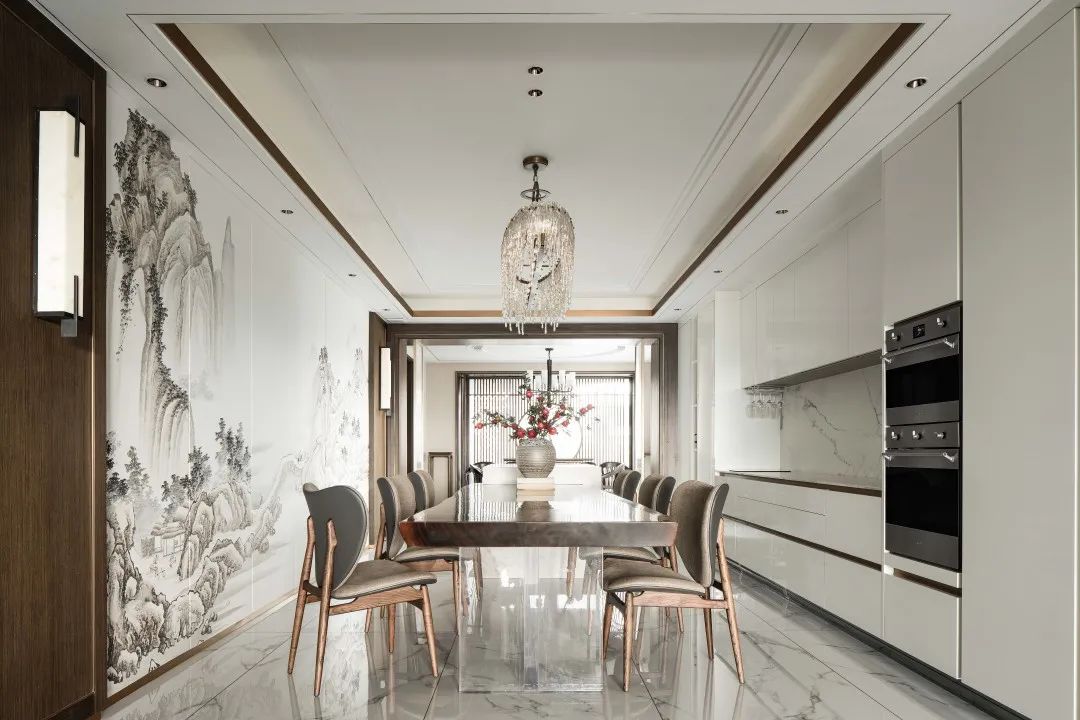 椭圆形水晶灯悬于中空,一侧是水墨晕染的山水画卷,一侧是现代简约的餐厨台,俩俩相望融于一体。