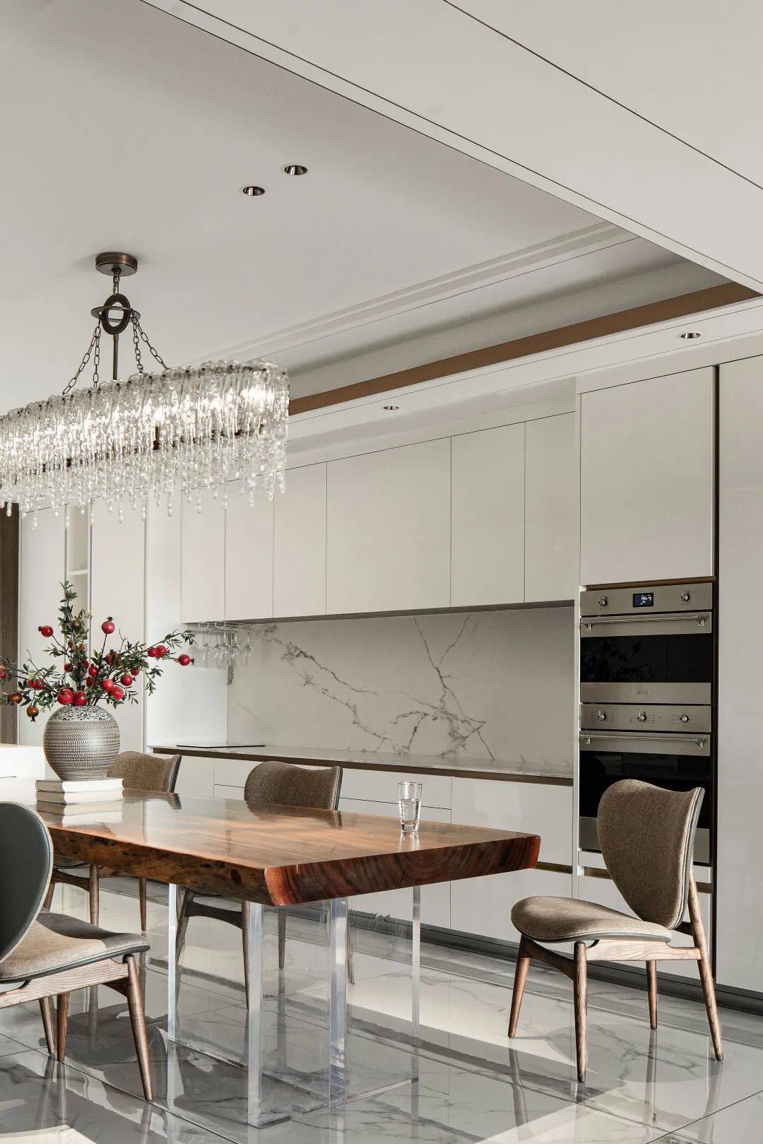 西餐厅利用中西混搭元素重建空间当代东方秩序。在白色基调的餐厅里,沉稳典雅的胡桃木与西厨岛台做结合,形成一个既中式又现代的西餐桌,让这个极简的空间不失传统稳重之美,所有的冲突矛盾在这里都显得那么自然合拍,中西合璧,活力十足。