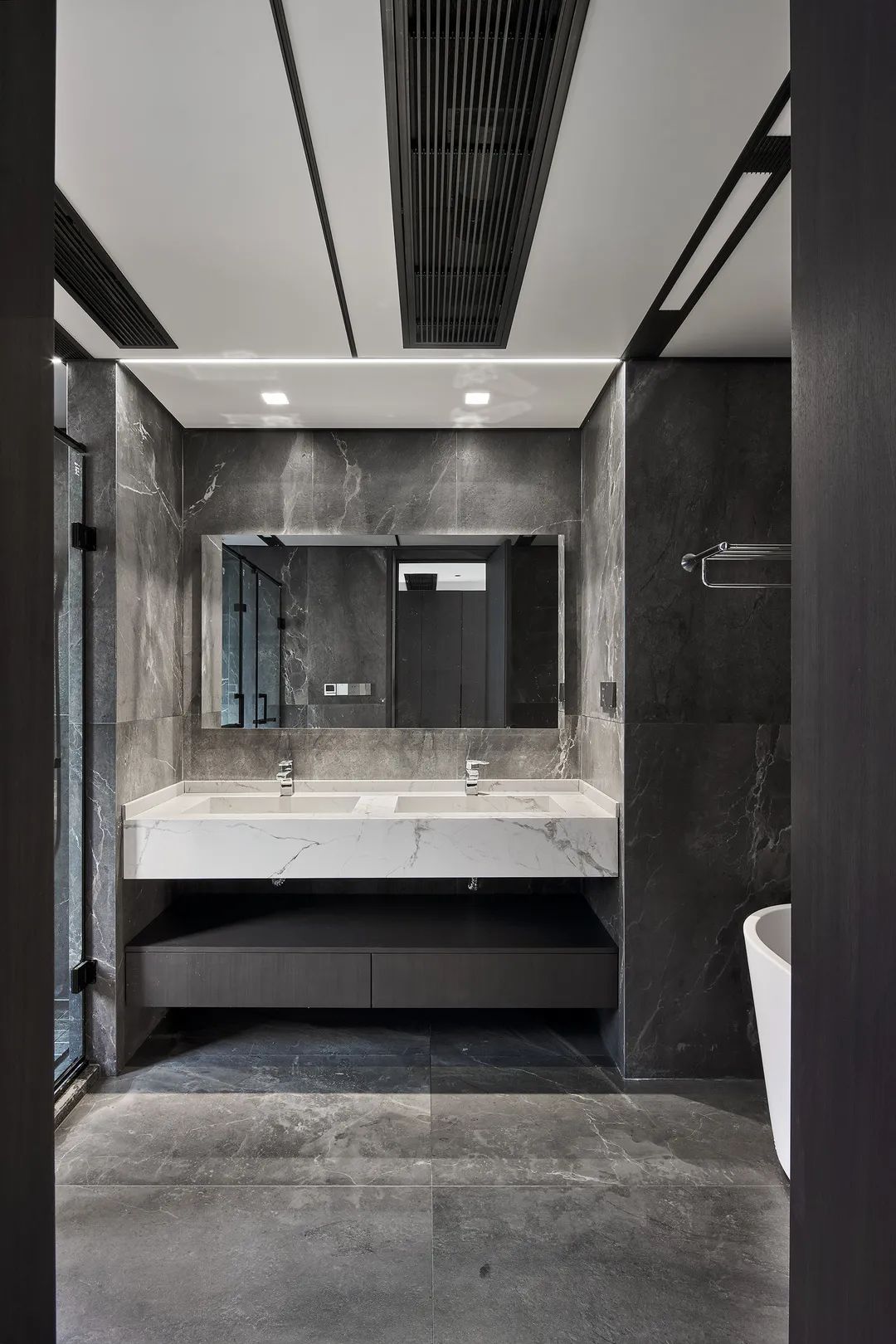 沉稳而内敛的视觉观感散布于每一个细节之中,墙、地不同的理石纹理赋予空间些许流动感,赋予空间感染力。