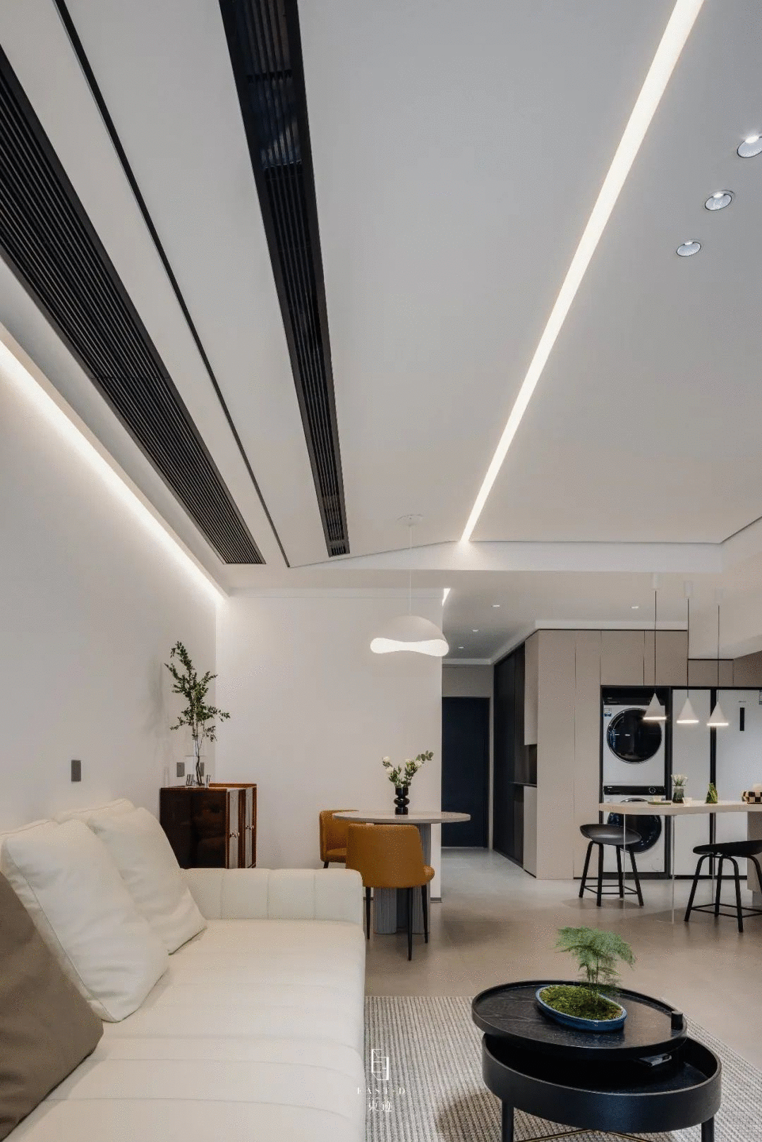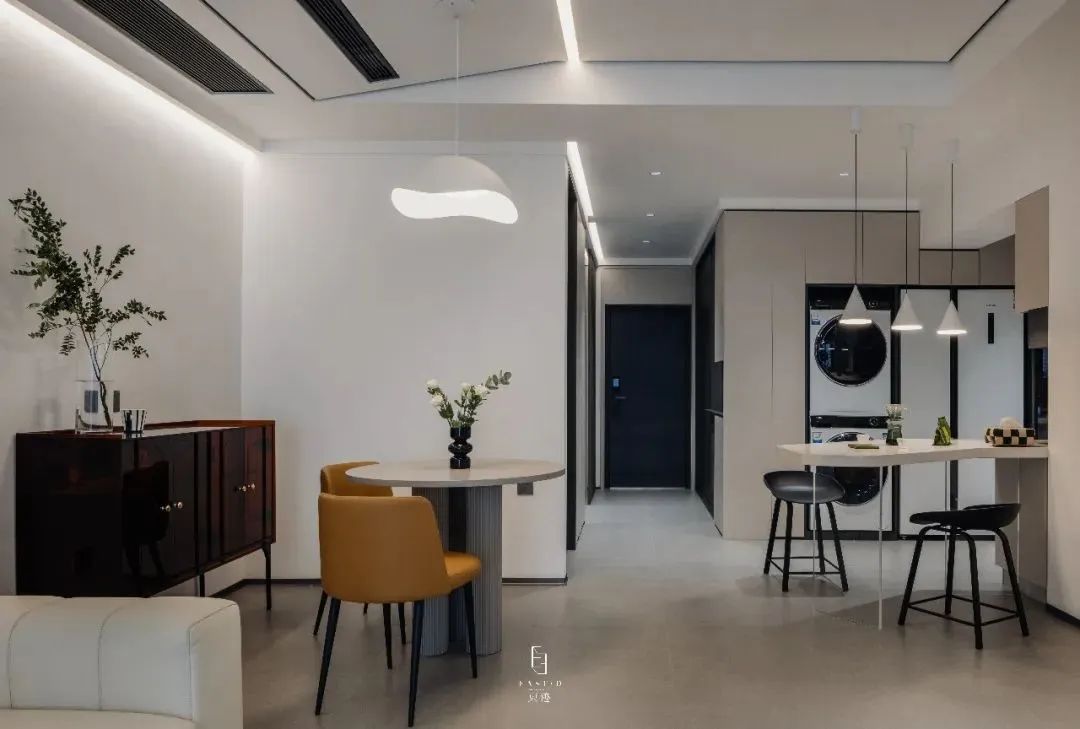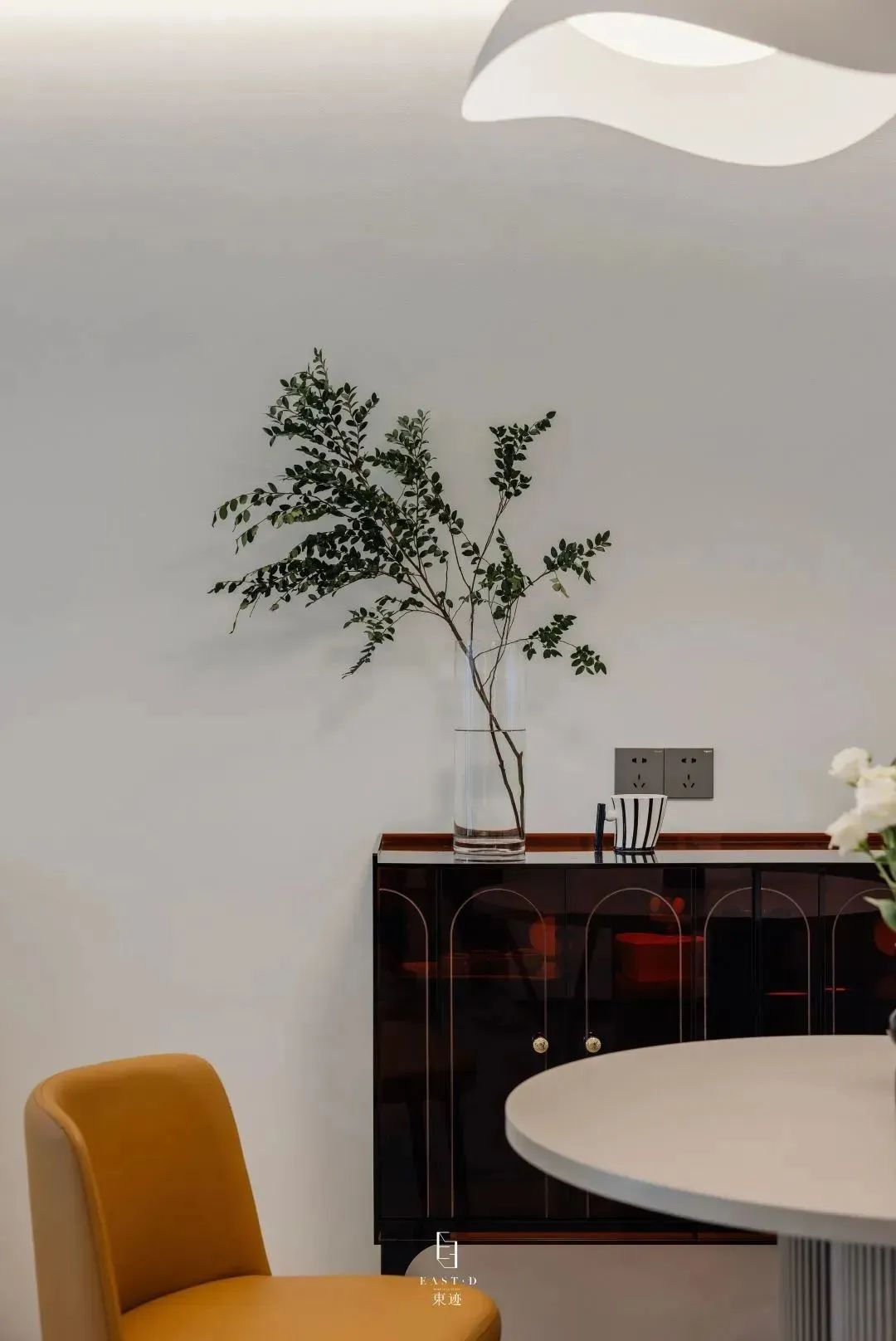 白色沙发旁边,一个黑红色边柜、一套圆融舒适的餐桌椅,在吊灯灯光渲染下的艺术性氛围圈定了餐厅的范围,玻璃瓶中的绿植很好地点缀了空间,将现代主义的生活美学淋漓展现。