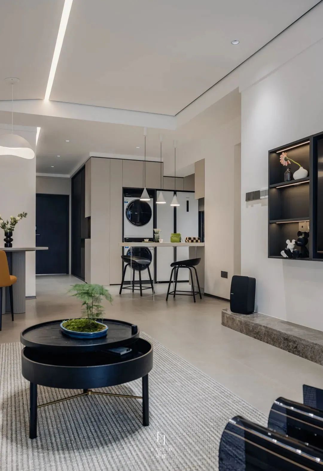 在厨房方向延伸出来的岛台,增添整个空间当中的设计感,同时也可以很好利用空间当中的布局,让空间更有实用性。