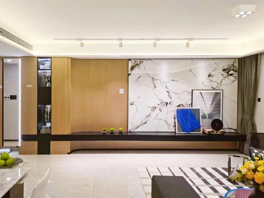 (官方实景) 样板房整体风格时尚、简约,有着现代居住要求的舒适感,空间中木材质的应用,又使空间渗透着沉稳的韵味。 项目地面用砖选用欧文莱的量子灰系列(9913),通铺客厅与餐厅区域,地砖的运用相较地板更能提升空间的通透感,简约明朗的视觉效果,增加了空间的延伸感。