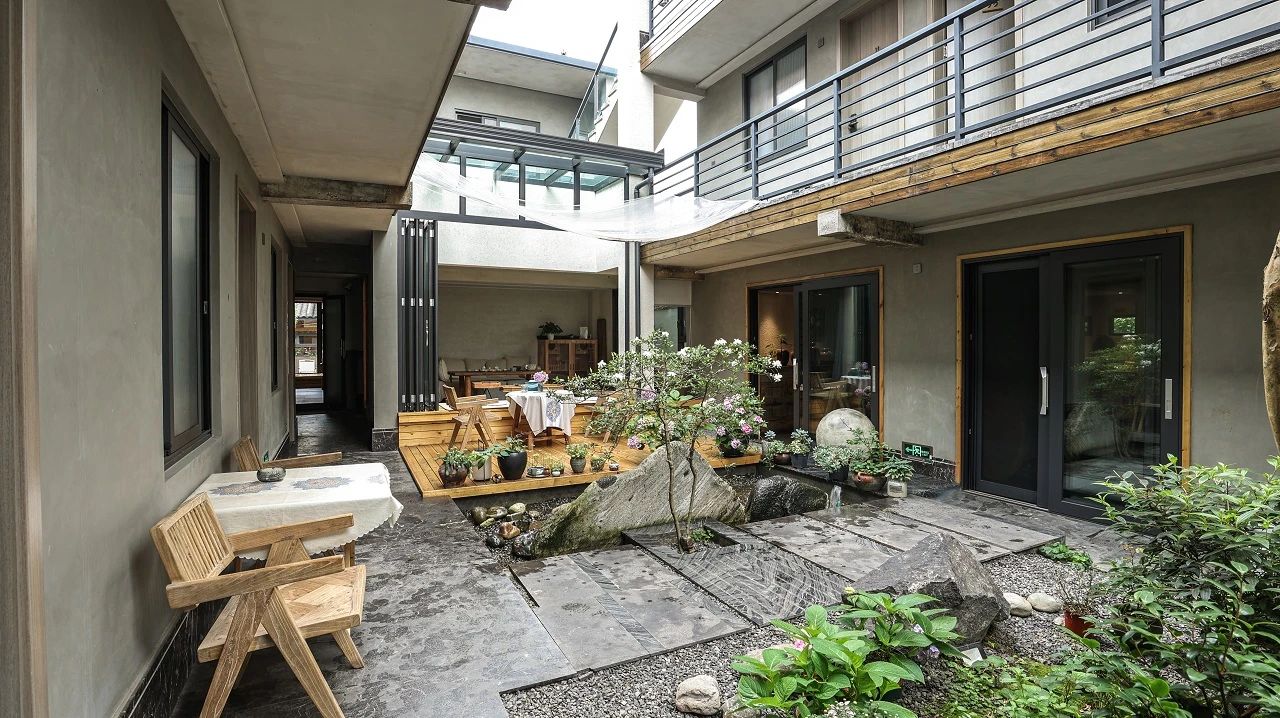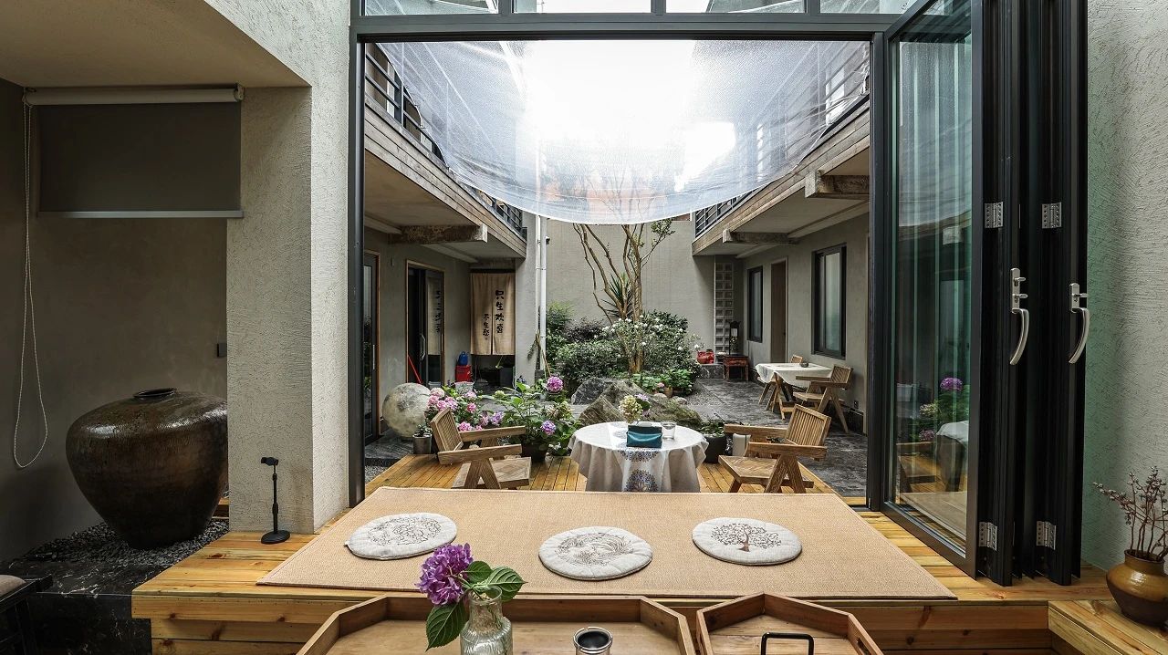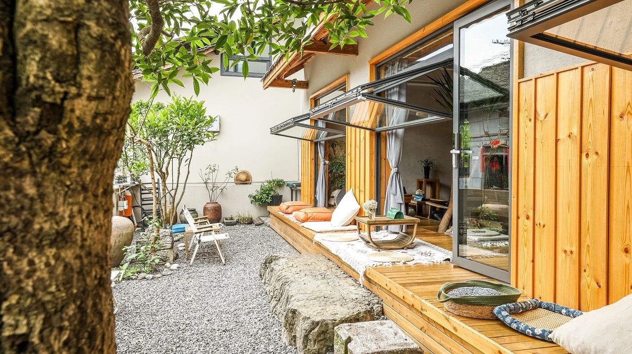 不时微风拂过绿意,将小院生机吹进眼底,“无印良木”原生态肌理带来自然的舒适感,与外间无缝衔接。疲倦瞬间消失,取而代之的是感油然而生的自然舒适。