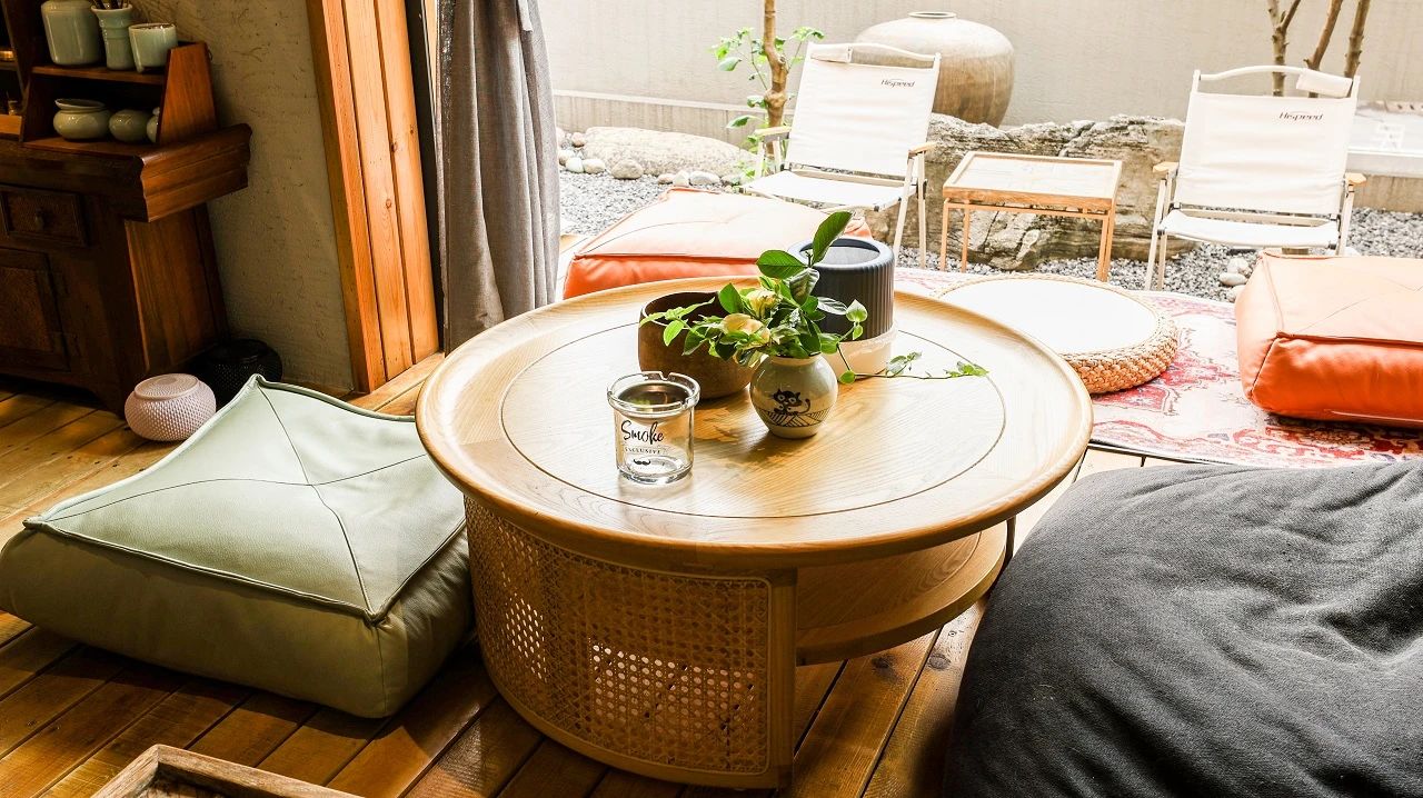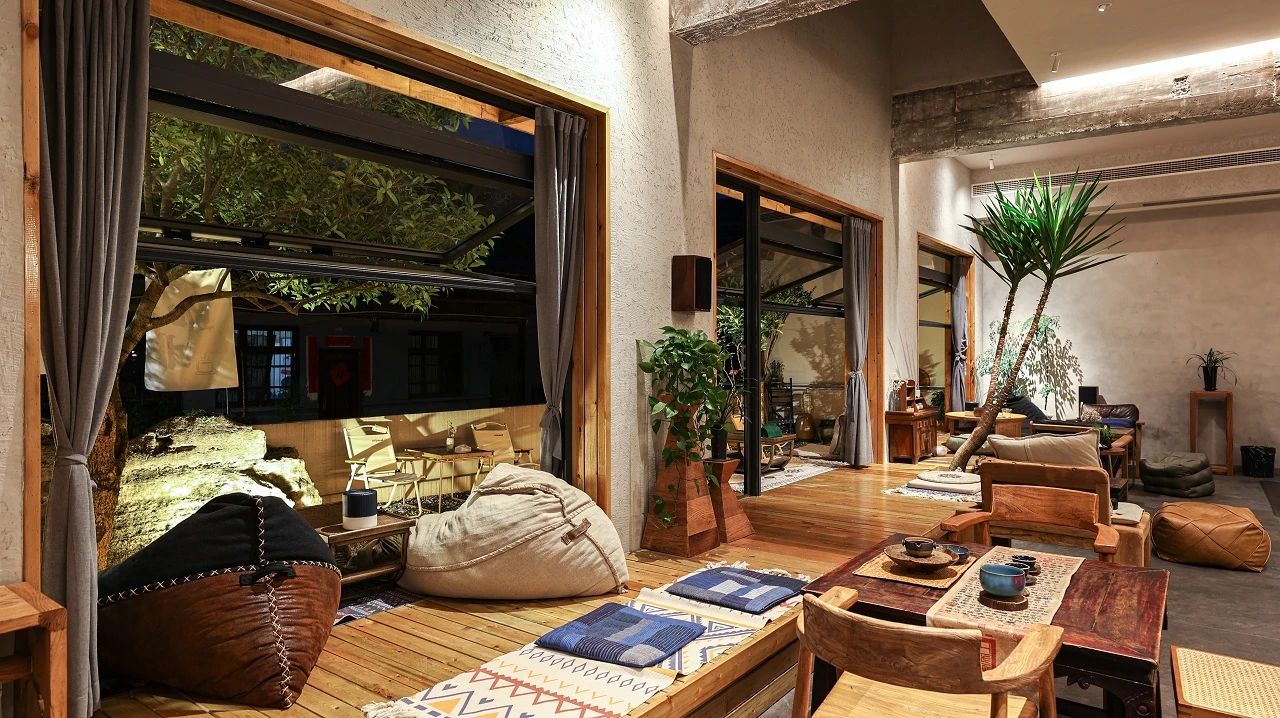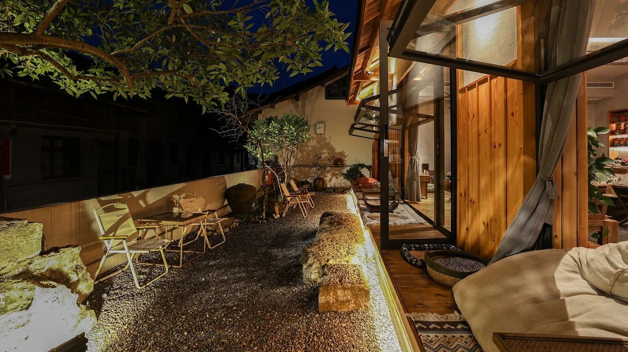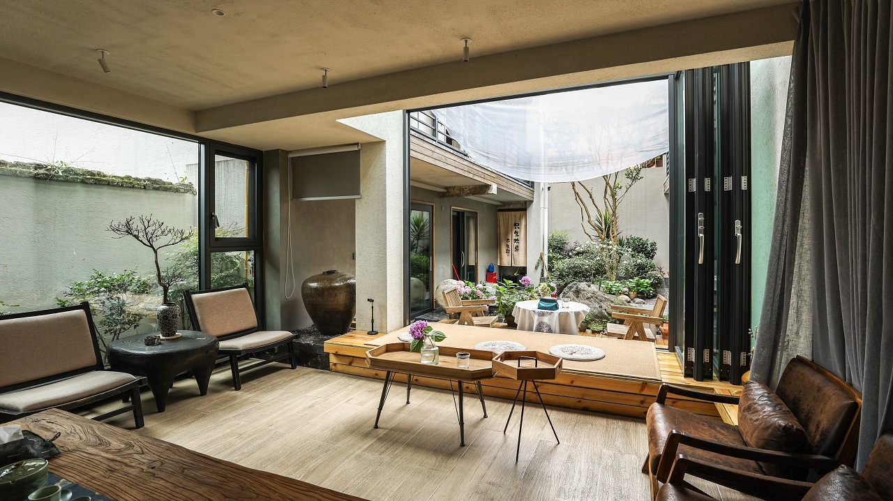 不时微风拂过绿意,将小院生机吹进眼底,“无印良木”原生态肌理带来自然的舒适感,与外间无缝衔接。疲倦瞬间消失,取而代之的是感油然而生的自然舒适。