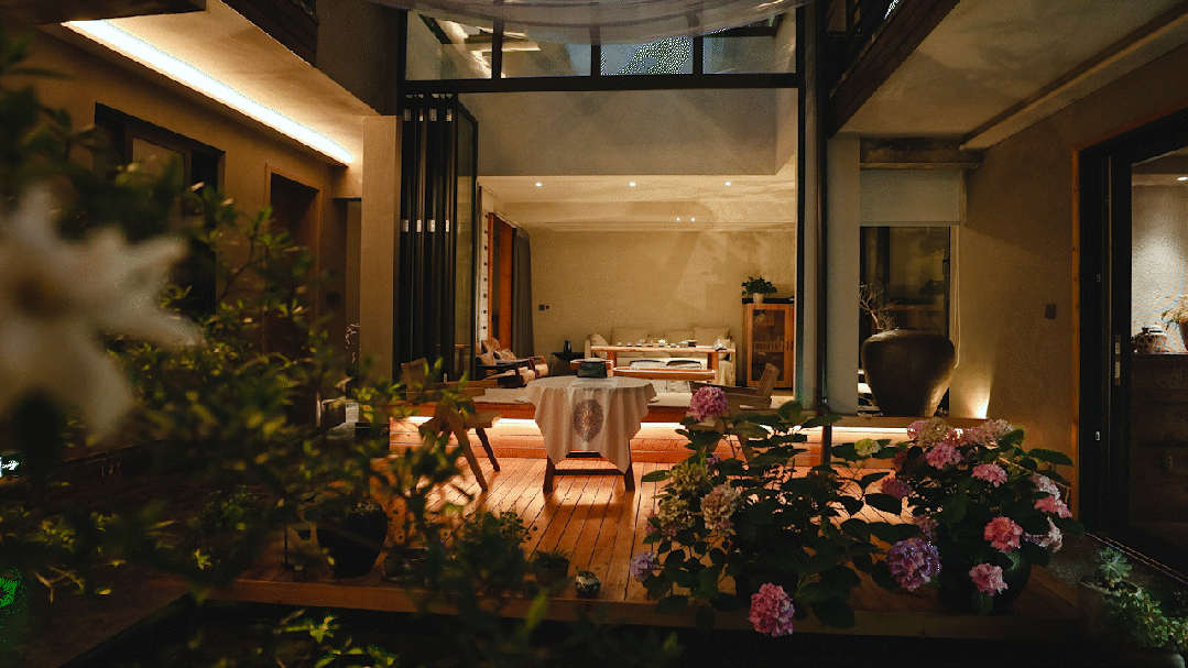白昼将空间尽可能多地置于阳光之下,温养提供修复歇息的场域,仿佛没有喧嚣与匆忙,便是一片温柔恬静。天气晴好时,舒适放松地随心而坐,与友人促膝长谈,与五湖四海结交,翻半本没看完的书,感受阳光细细密密地洒在身上,静享时光。