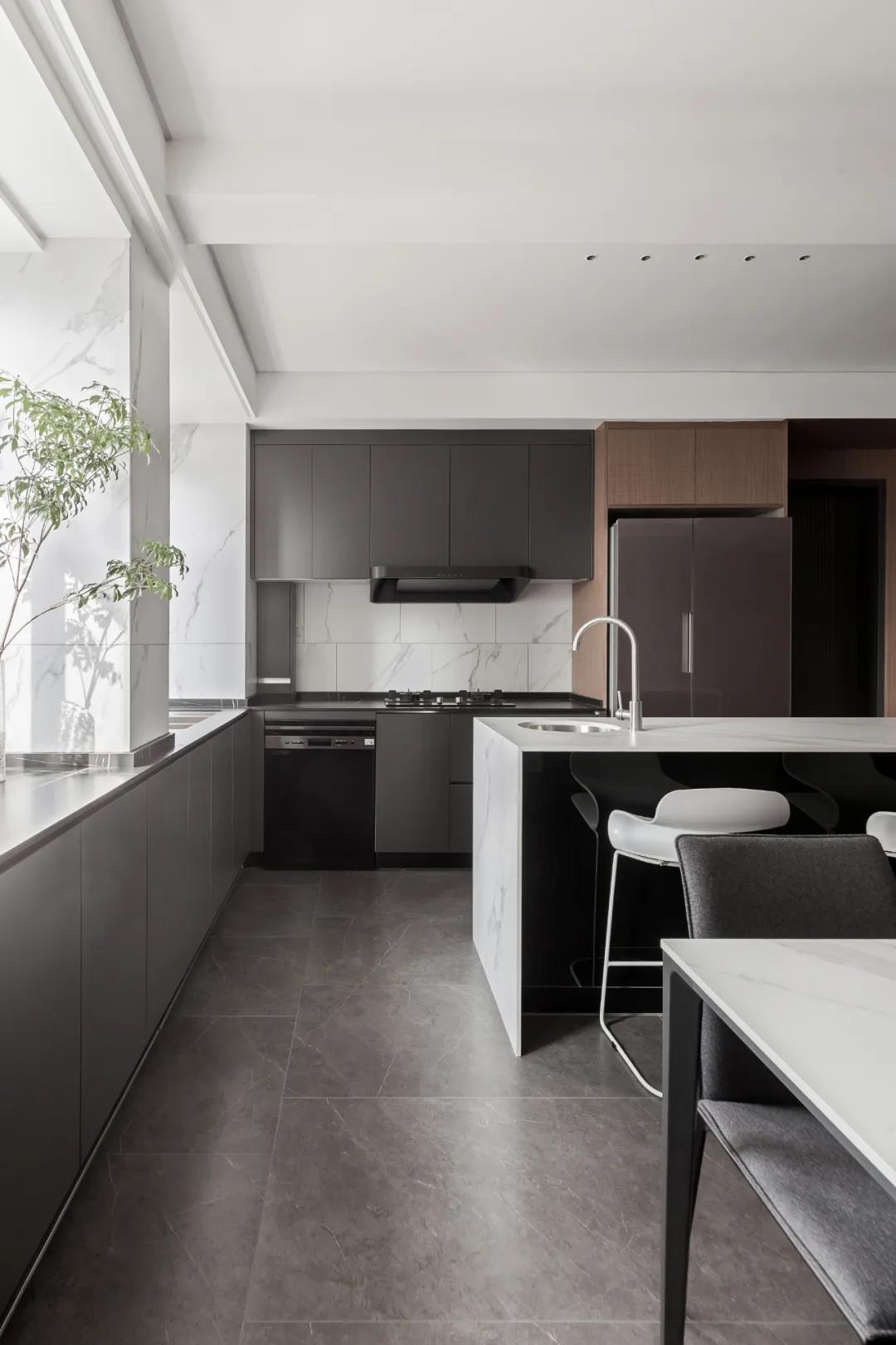 深灰色柜体如“欧文莱灰”系列的延伸,与“卡拉拉”系列形成一个对比互动;同时提供了储物场所,最大化利用空间的同时,也能完善收纳美学。