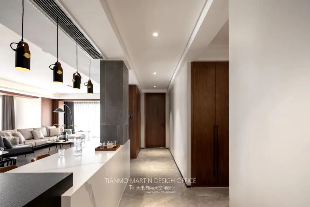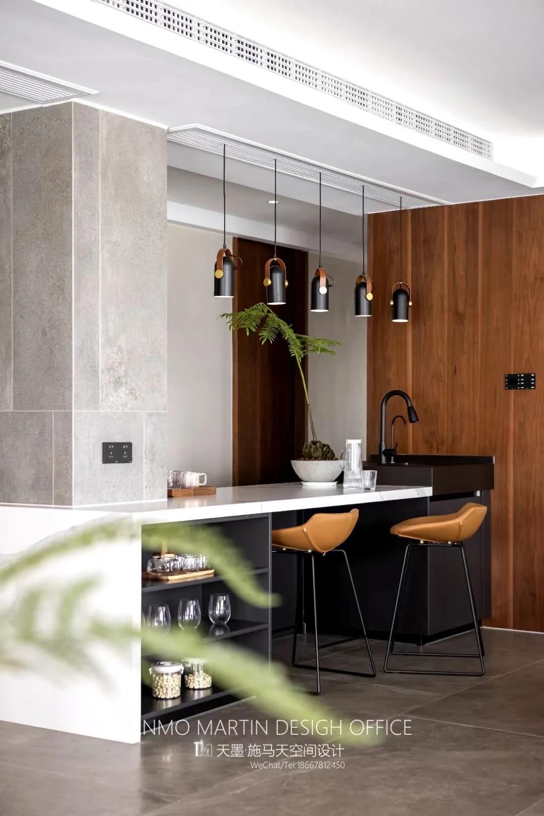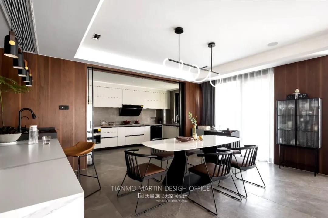 餐厅区域同样以黑白灰素色为基调,暖木色的墙身,凸显就餐环境的自然雅致。