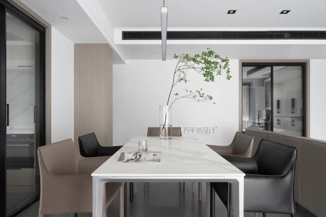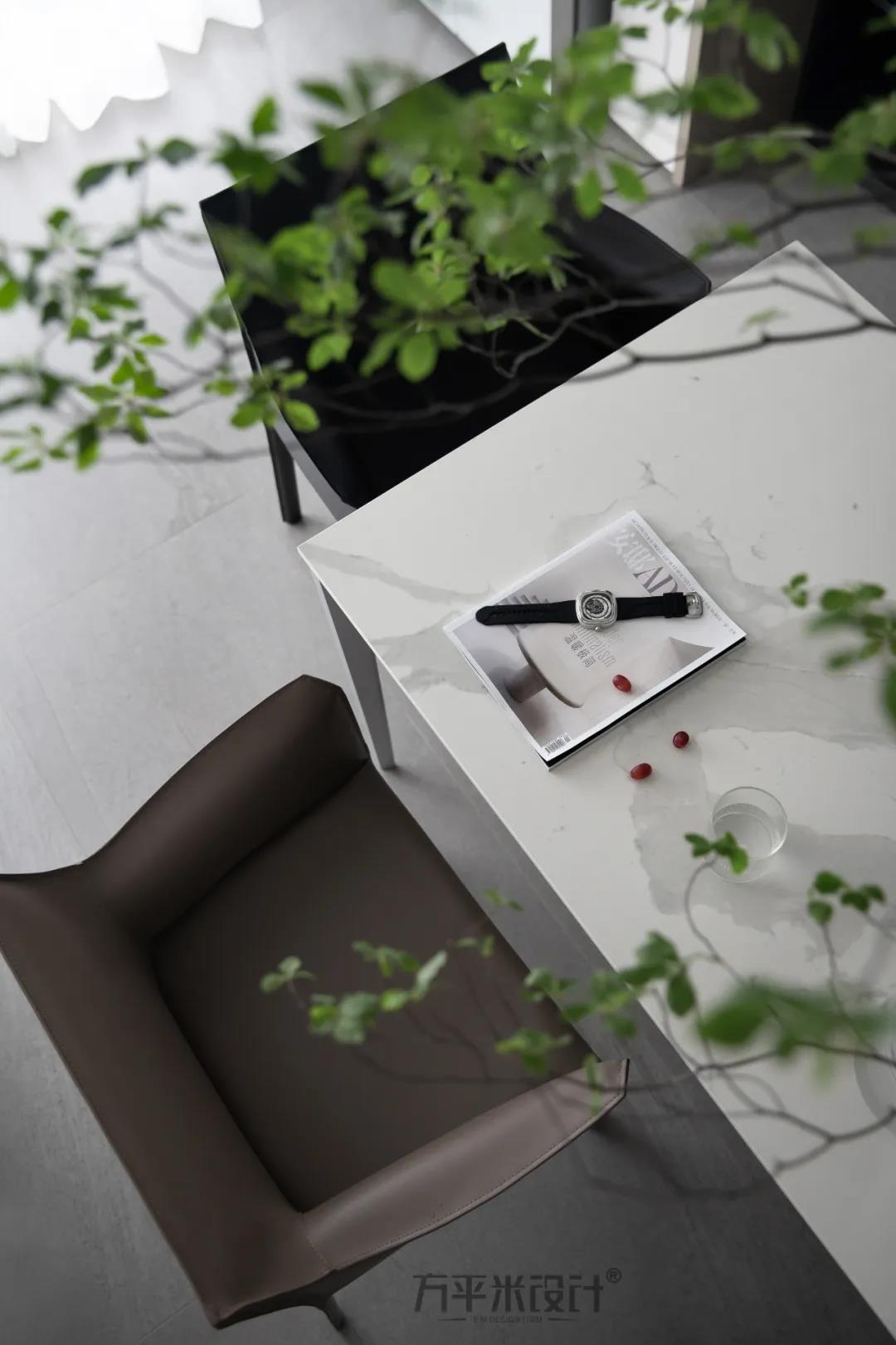 不同深浅的餐椅,交错放置在餐桌的两侧,呈现出"和而不同"的丰富空间感。