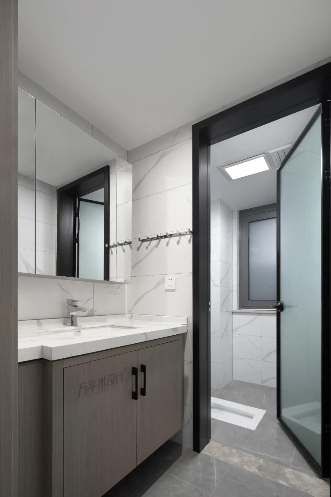 与厨房一样,墙面应用了“卡拉拉”系列,经典百搭的白色身姿呈现光亮洁净的视觉效果,搭配简约耐脏的灰调暗纹地砖,提升空间的层次感,缓解采光不足的问题。