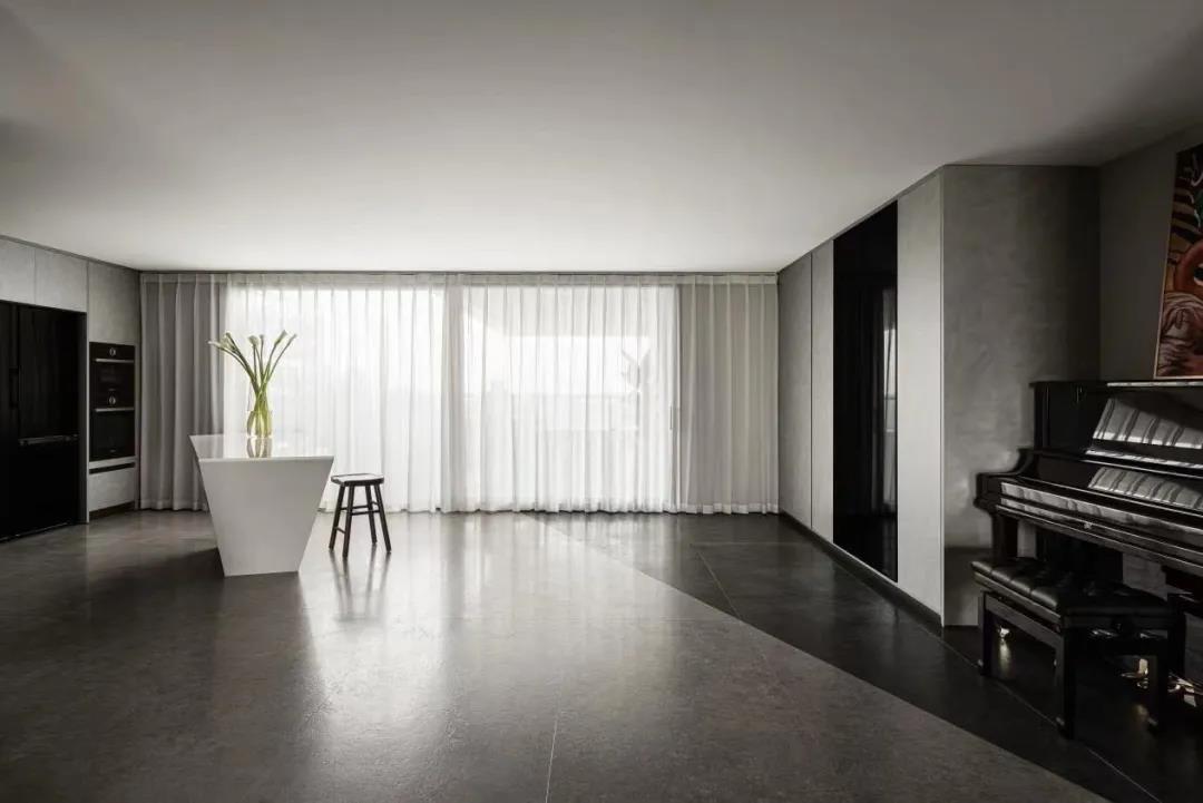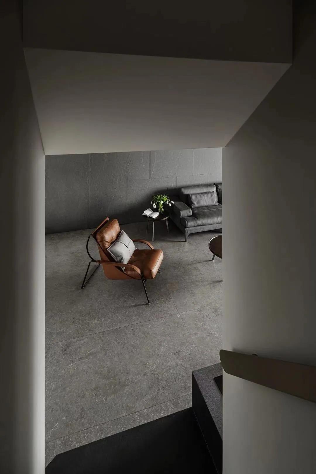 设计师深知Luke长期在高空飞行,精神时常处于高压之下,于是使用低饱和度的色彩,可以有效缓解精神紧张。整个空间有着飞行器般的利落感,干净、简洁,黑白灰的色彩从容地过渡,犹如白天和黑夜的交替,多了一丝安静的美好。 还有很多呼应Luke职业特征的设计表达,例如厨房岛台犹如机翼的形态,地面黑白分界线就像黎明天际线的体现,低调内敛地呼应着Luke在飞行时的自由状态。 / 生活与温度 一层开阔通透,设计师把原始格局进行打破重组,减少公共空间的墙体阻隔,规整出一个具有整体性、通透感的空间。客厅、餐厨…布局动线中充满值得探索的小心思,相互互通,满足功能需求之外,简洁的素色主调,干净利落的线条感,整个空间给人以舒缓治愈的心理感受。