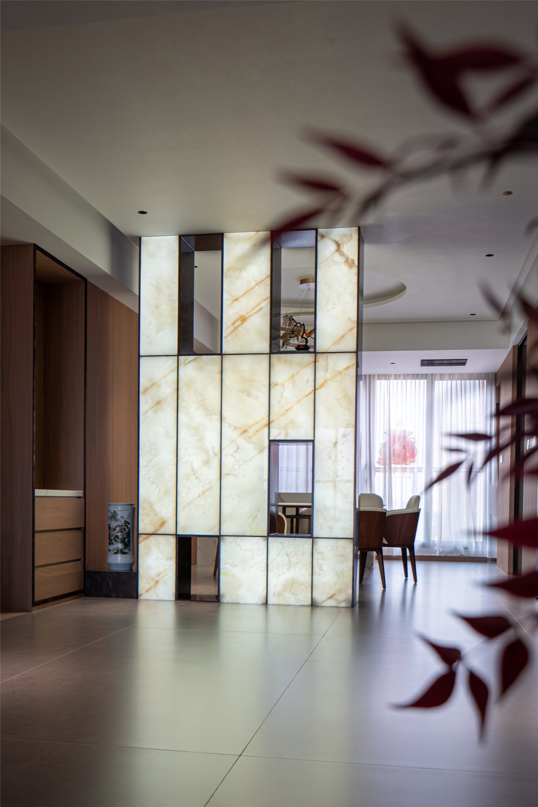 本案设计师主要从色调、灯光、选材进行考量,入户背景选用了天然石材鱼肚金与不锈钢、木饰面相结合,由于原先门厅光线较暗,为了拥有更好的空间感和采光,增加了带有灯光的氛围设计,使得整体明亮又大气。