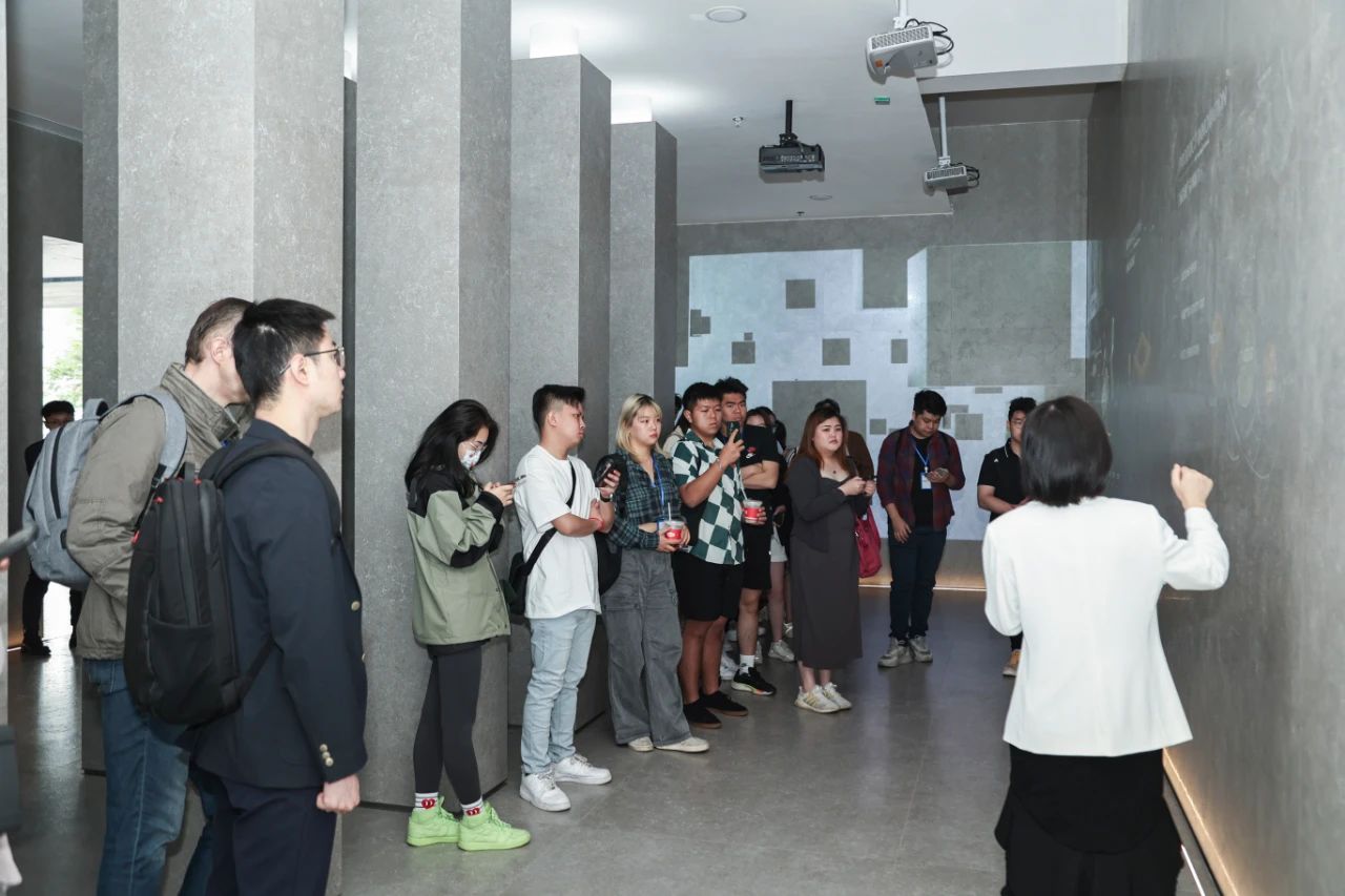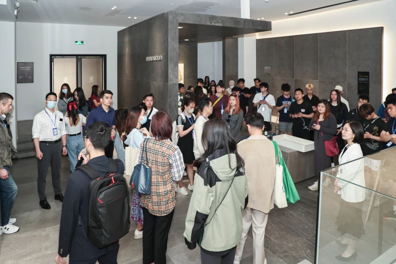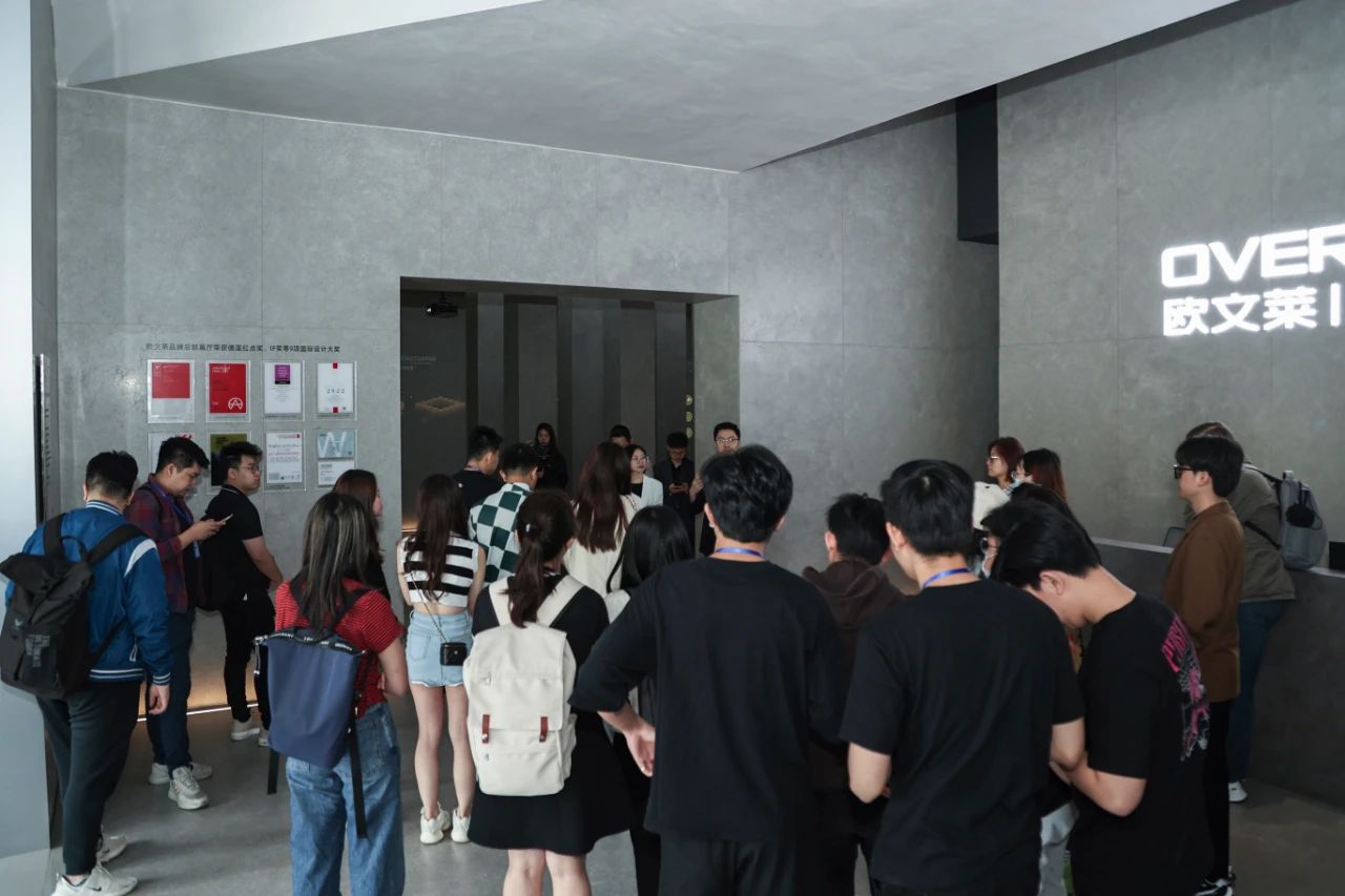 ▽ 来自俄罗斯、韩国、马来西亚、印度尼西亚等国家留学生代表组成的参访团,在欧文莱公司品牌营销中心策划总监文映人的陪同下参观了解欧文莱素色美学馆。