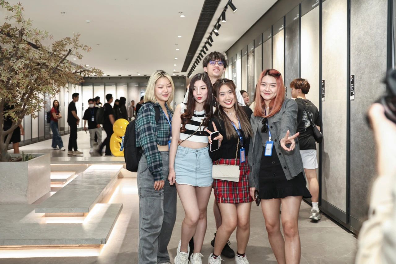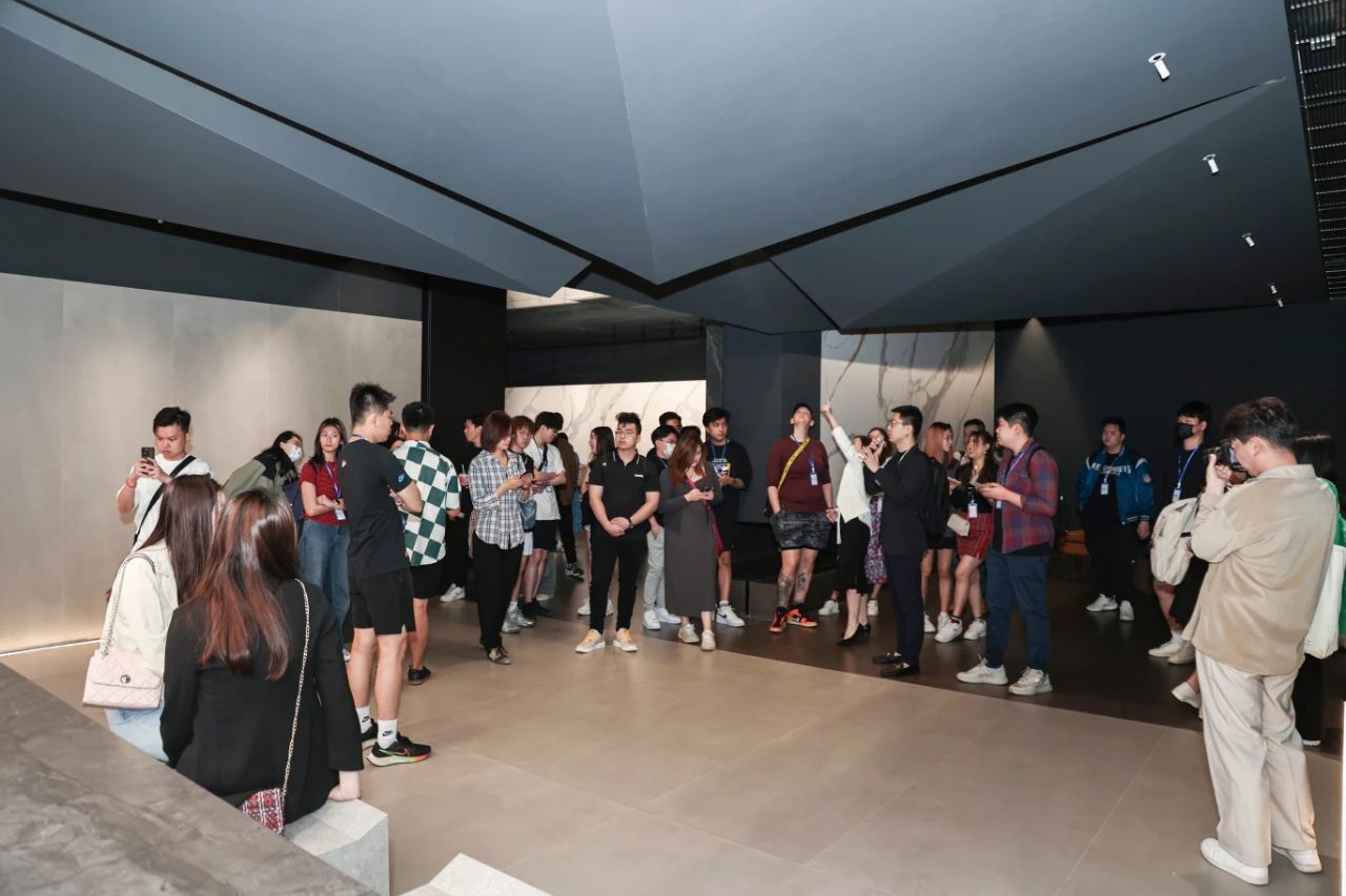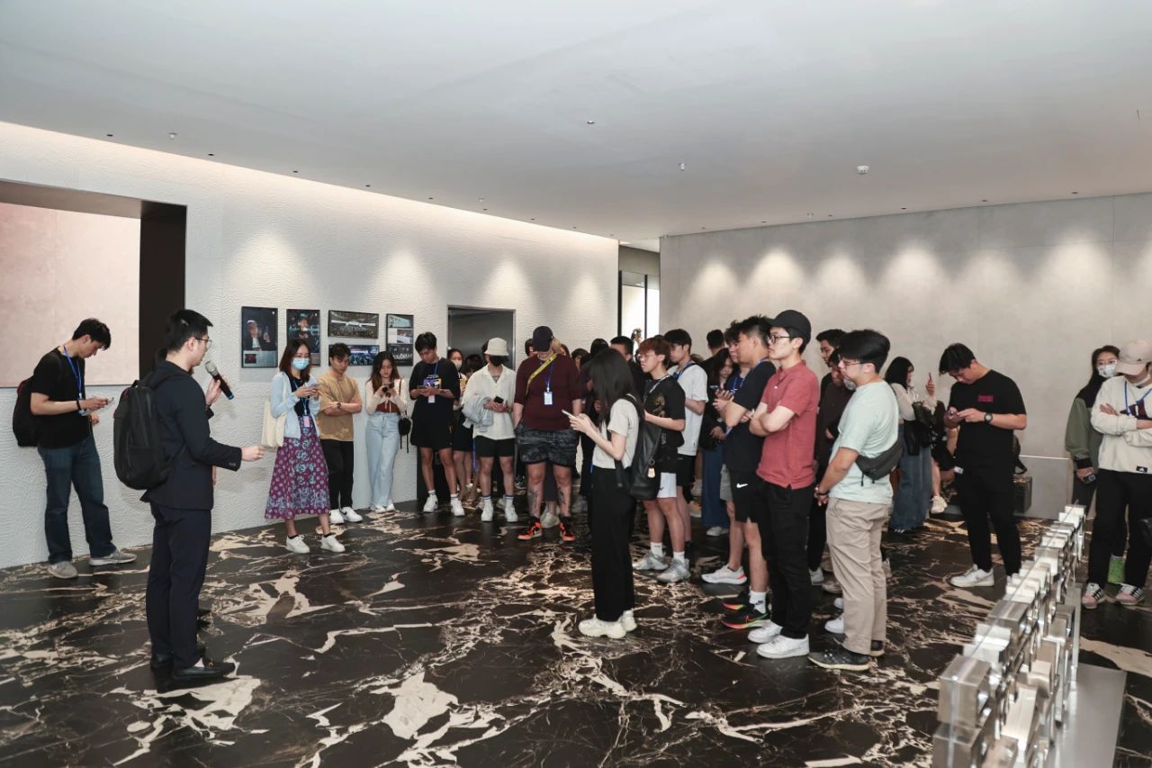 ▽ 来自俄罗斯、韩国、马来西亚、印度尼西亚等国家留学生代表组成的参访团,在欧文莱公司品牌营销中心策划总监文映人的陪同下参观了解欧文莱素色美学馆。