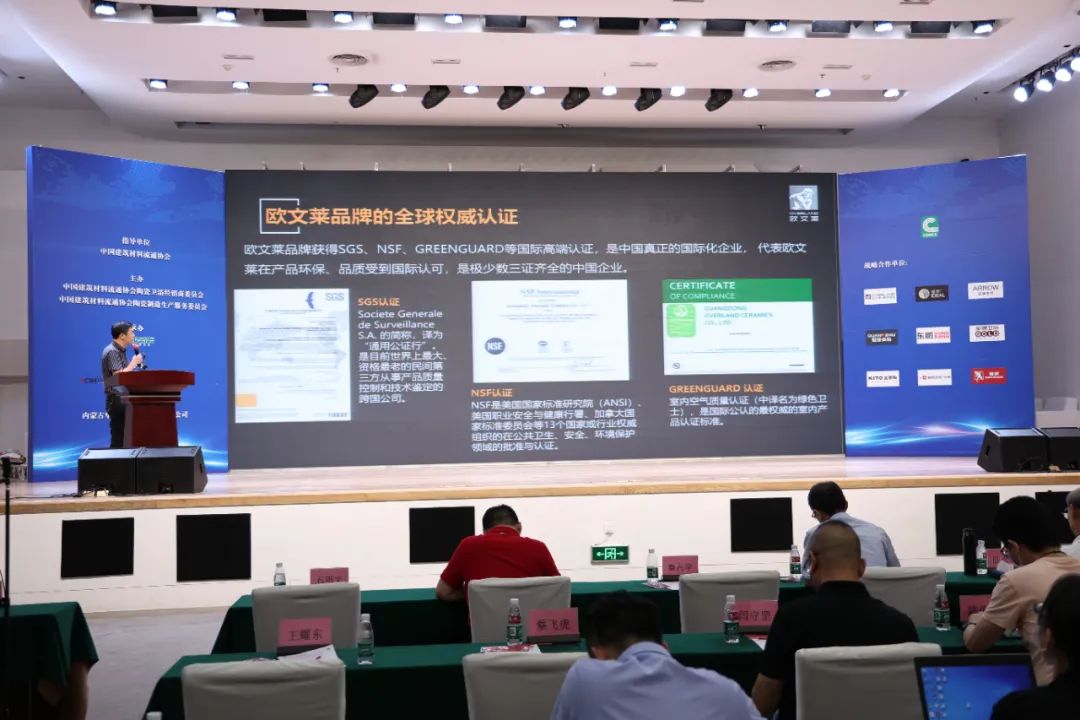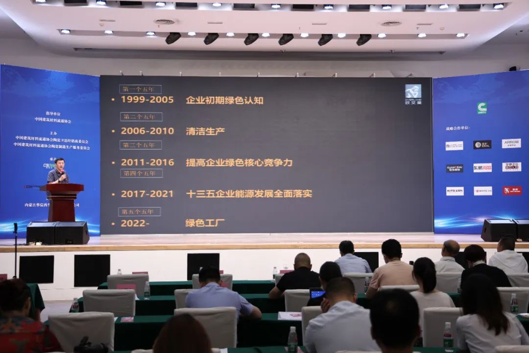 作为绿色建材企业代表之一,欧文莱受邀出席本次活动。会上,欧文莱运营中心总经理石明文分享了欧文莱陶瓷绿色工厂发展之路上,不同阶段里欧文莱的准备和改进工作。欧文莱在绿色发展的一系列战略与行动,都是紧随国家号召步调,与整个产业链发展相挂钩。