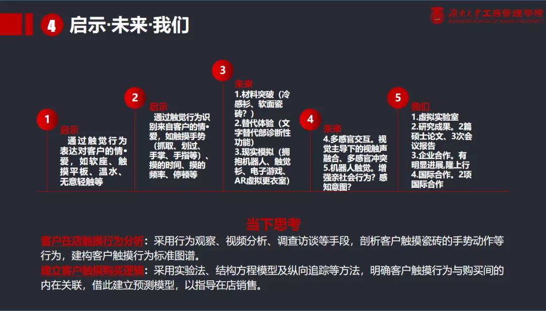 “陶瓷行业在研究产品之时,终于有企业把用户的情感需求放在了工艺、技术之前。”这是这次摸摸节知识下午茶带给笔者惊喜的地方。瓷砖在人类的认知之中是冰冷的,这样的冰冷与家的温馨似乎不太和谐。欧文莱的创新从情感以及人类的原始需求出发,这样的维度已然超越了传统瓷砖设计的维度,这样的维度也势必给瓷砖行业带来颠覆性的革命。欧文莱不仅发现了触觉对人类情感的影响,并且着手于系统性研究。这样的系统性研究离不开专业学术领域的加持赋能。去年,欧文莱与涂阳军博士团队共同创立中国首座瓷砖触感研究所。这一次摸摸节知识下午茶,涂阳军博士也带着他最新的研究发现进行了分享。