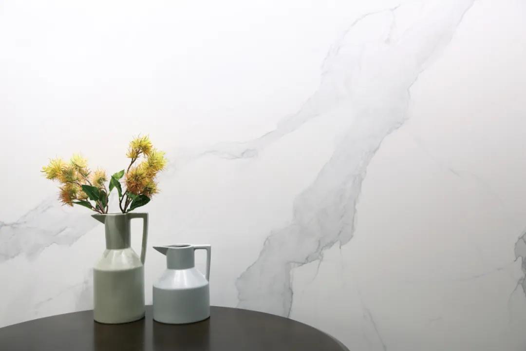 岩板一片到顶的简约特性、多样化的材质仿真、稳定抗污耐磨防腐易清洁特性、长效的使用寿命,这种综合能力是墙纸、墙布、木质板等难以体现的。