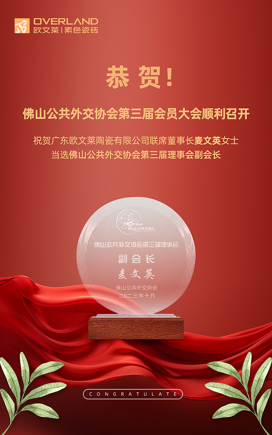 广东欧文莱陶瓷有限公司联席董事长麦文英表示,将积极履行职能职责,亦将以此为契机,明确企业所应承担的责任,引领欧文莱深刻了解中国特色大国外交的新布局,认识理解新时代的国际格局下的外交理念和内涵,为佛山经济社会发展与对外交流合作贡献力量。