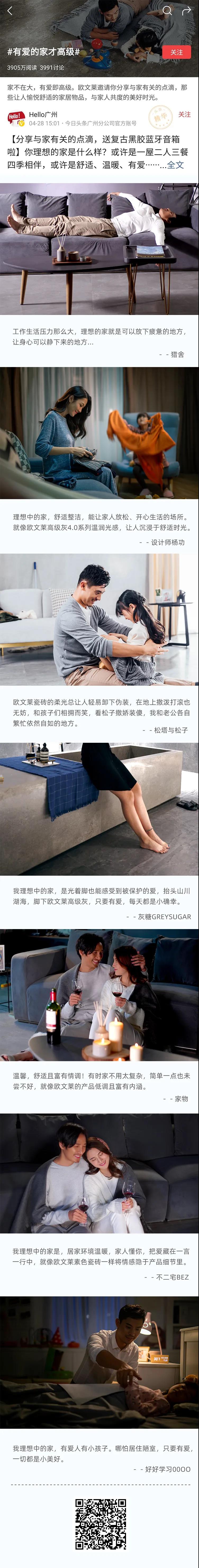 上半年,欧文莱素色瓷砖联手字节跳动发起#有爱的家才高级#话题活动,邀请“今日头条”APP平台用户分享与家有关的点滴,那些让人愉悦舒适的家居物品,与家人共度的美好时光。截至今天,今日头条#有爱的家才高级#微头条话题阅读量达到3905万!小编截取了部分留言互动,看看在普通业主、设计师、家居博主等不同身份用户的眼中,理想的家是什么样的?